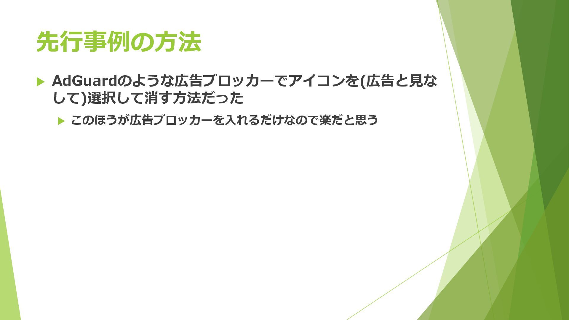 先⾏事例の⽅法 u AdGuardのような広告ブロッカーでアイコンを(広告と⾒な して)選択して消す⽅法だった u このほうが広告ブロッカーを⼊れるだけなので楽だと思う