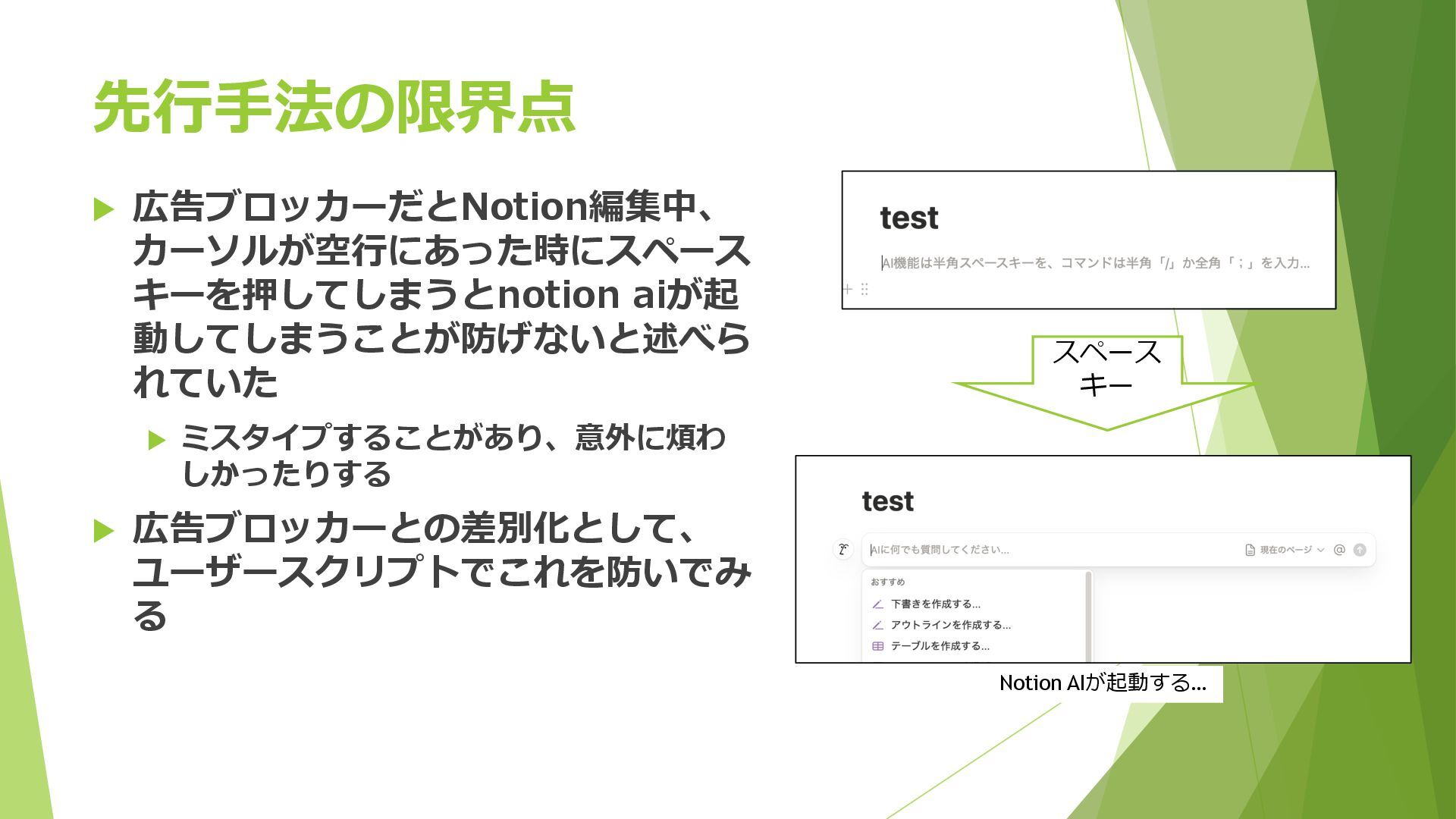 しかったりする u 広告ブロッカーとの差別化として、 ユーザースクリプトでこれを防いでみ る スペース キー Notion AIが起動する…