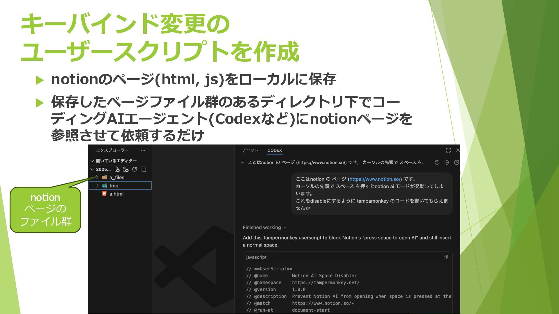 キーバインド変更の ユーザースクリプトを作成 u notionのページ(html, js)をローカルに保存 u 保存したページファイル群のあるディレクトリ下でコー ディングAIエージェント(Codexなど)にnotionページを 参照させて依頼するだけ notion
