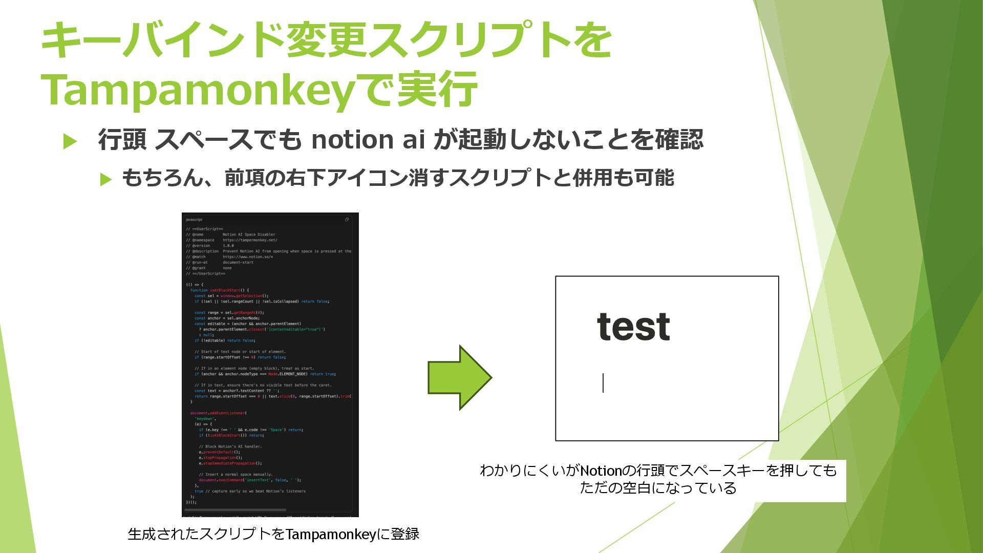 キーバインド変更スクリプトを Tampamonkeyで実⾏ u ⾏頭 スペースでも notion ai が起動しないことを確認 u もちろん、前項の右下アイコン消すスクリプトと併⽤も可能