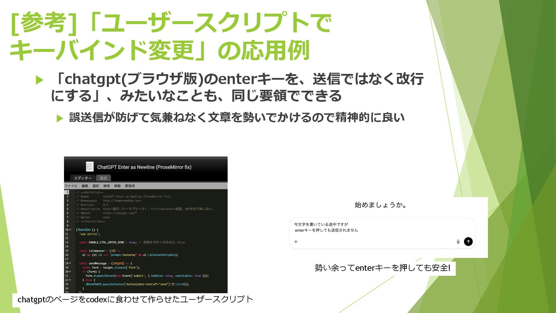 [参考]「ユーザースクリプトで キーバインド変更」の応⽤例 u 「chatgpt(ブラウザ版)のenterキーを、送信ではなく改⾏ にする」、みたいなことも、同じ要領でできる u 誤送信が防げて気兼ねなく⽂章を勢いでかけるので精神的に良い 勢い余ってenterキーを押しても安全! chatgptのページをcodexに⾷わせて作らせたユーザースクリプト