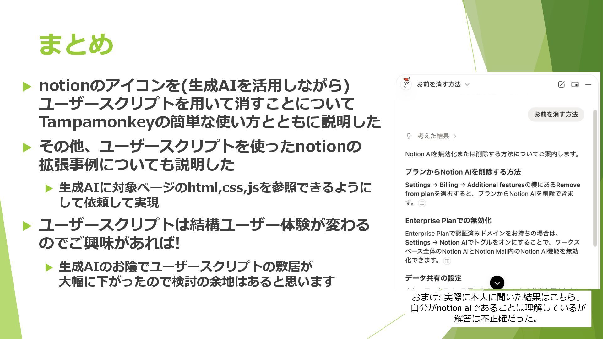 まとめ u notionのアイコンを(⽣成AIを活⽤しながら) ユーザースクリプトを⽤いて消すことについて Tampamonkeyの簡単な使い⽅とともに説明した u その他、ユーザースクリプトを使ったnotionの 拡張事例についても説明した u ⽣成AIに対象ページのhtml,css,jsを参照できるように