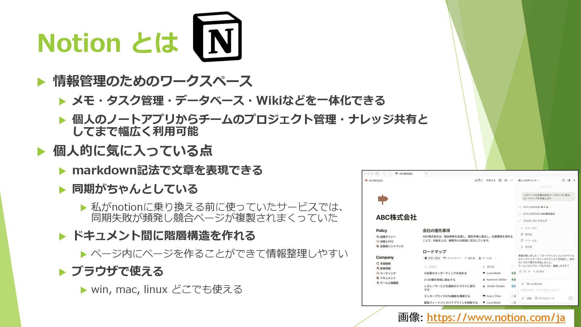個⼈的に気に⼊っている点 u markdown記法で⽂章を表現できる u 同期がちゃんとしている u 私がnotionに乗り換える前に使っていたサービスでは、 同期失敗が頻発し競合ページが複製されまくっていた u ドキュメント間に階層構造を作れる u ページ内にページを作ることができて情報整理しやすい u ブラウザで使える u win, mac, linux どこでも使える 画像: https://www.notion.com/ja