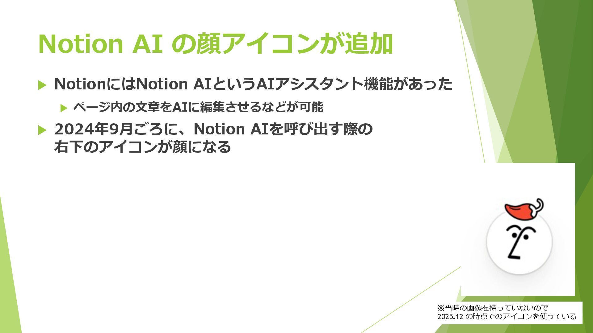 Notion AI の顔アイコンの煩わしさ u ユーザが操作していない状態の時、gifアニメで顔が動く。 このアニメーションが⾮常に煩わしかった u 2025.12時点では動きがマイルドになっているが、実装された当 時はディズニー映画みたいなダイナミックな動きで顔がキョロキョ ロしていた