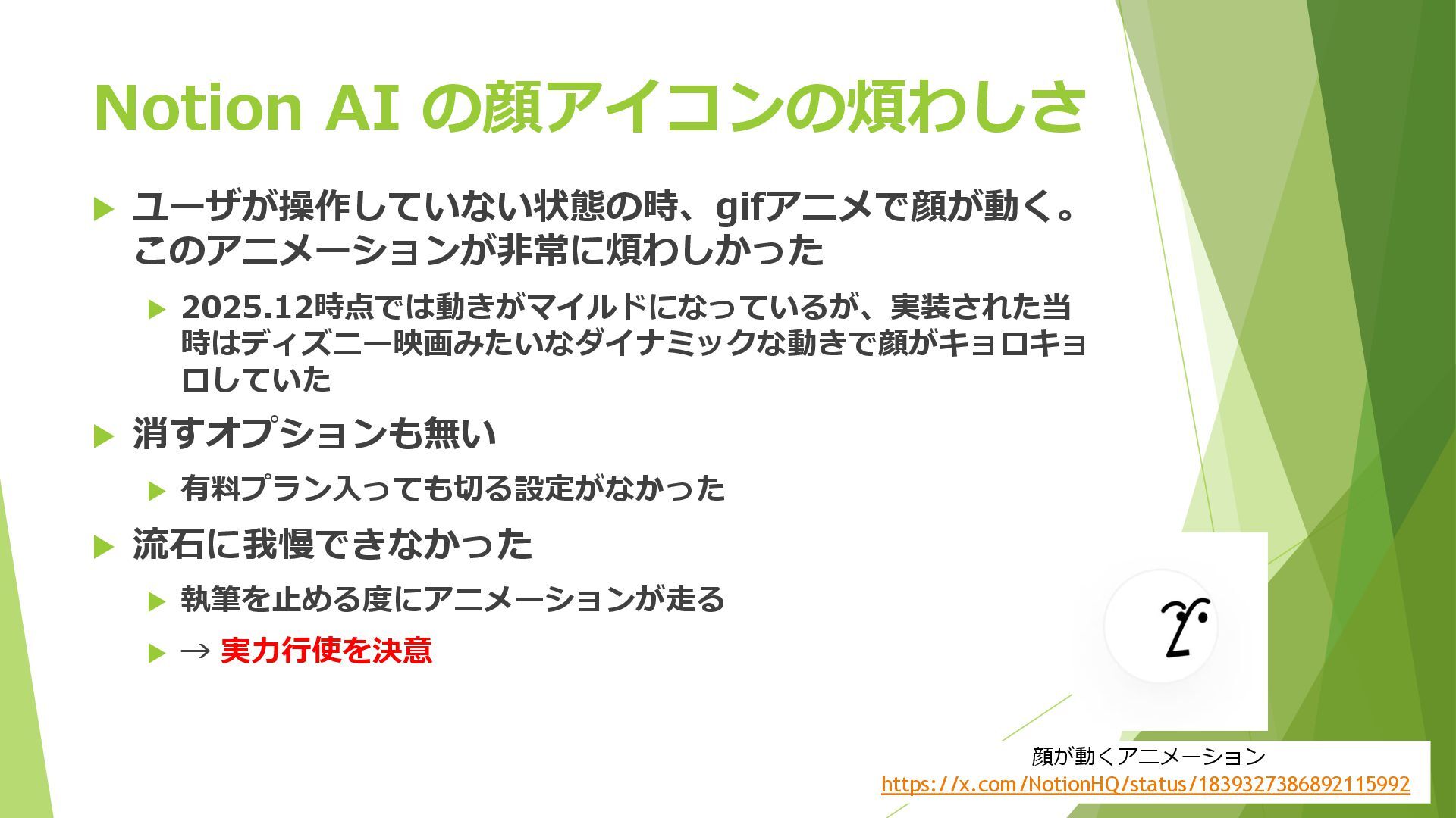 u 消すオプションも無い u 有料プラン⼊っても切る設定がなかった u 流⽯に我慢できなかった u 執筆を⽌める度にアニメーションが⾛る u → 実⼒⾏使を決意 顔が動くアニメーション https://x.com/NotionHQ/status/1839327386892115992