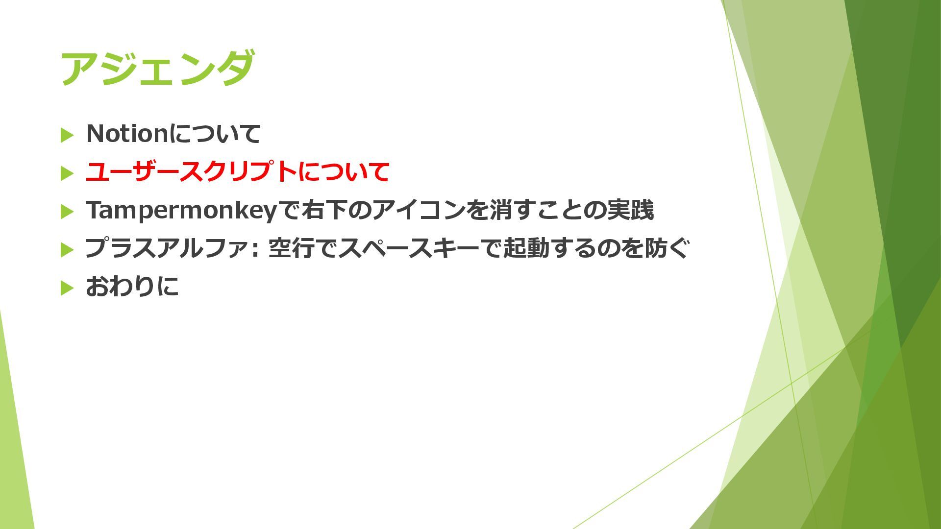 アジェンダ u Notionについて u ユーザースクリプトについて u Tampermonkeyで右下のアイコンを消すことの実践 u プラスアルファ: 空⾏でスペースキーで起動するのを防ぐ