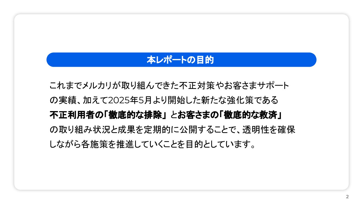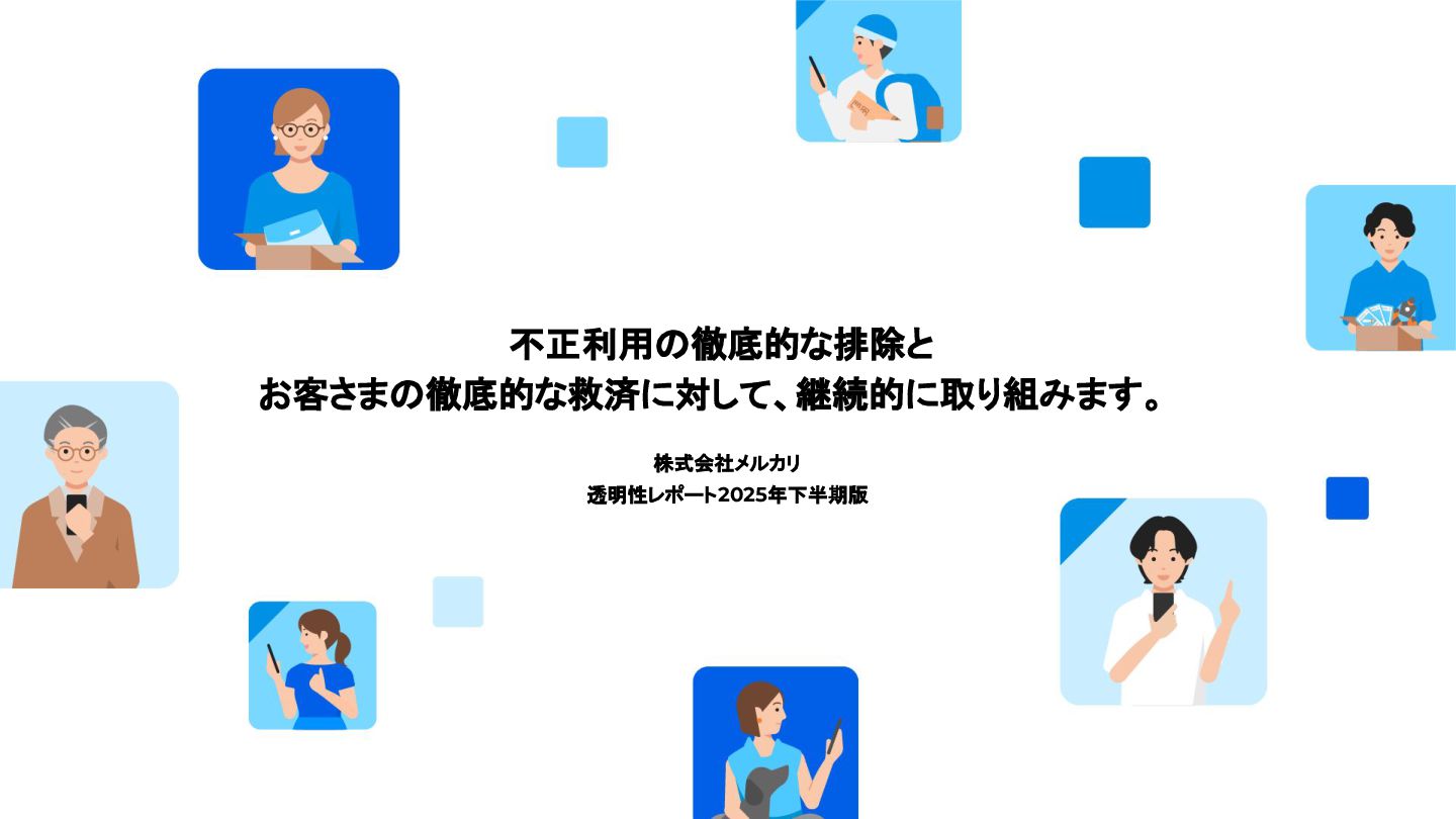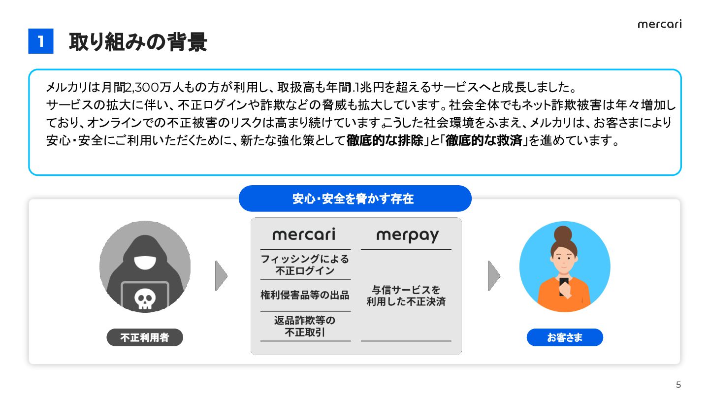 年々増加しており、オンラインでの不正被害のリスクは高まり続けています。こうした社会環境をふまえ、 メルカリは、お客さまにより安心・安全にご利用いただくために、新たな強化策として「徹底的な排除」と 「徹底的な救済」を進めています。
