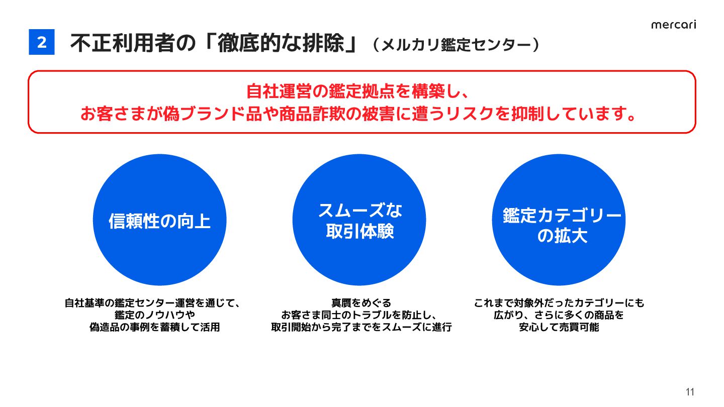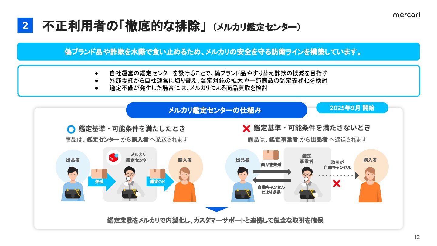 の拡大 スムーズな 取引体験 信頼性の向上 不正利用者の「徹底的な排除」(メルカリ鑑定センター) 2 11 自社運営の鑑定拠点を構築し、 お客さまが偽ブランド品や商品詐欺の被害に遭うリスクを抑制しています。