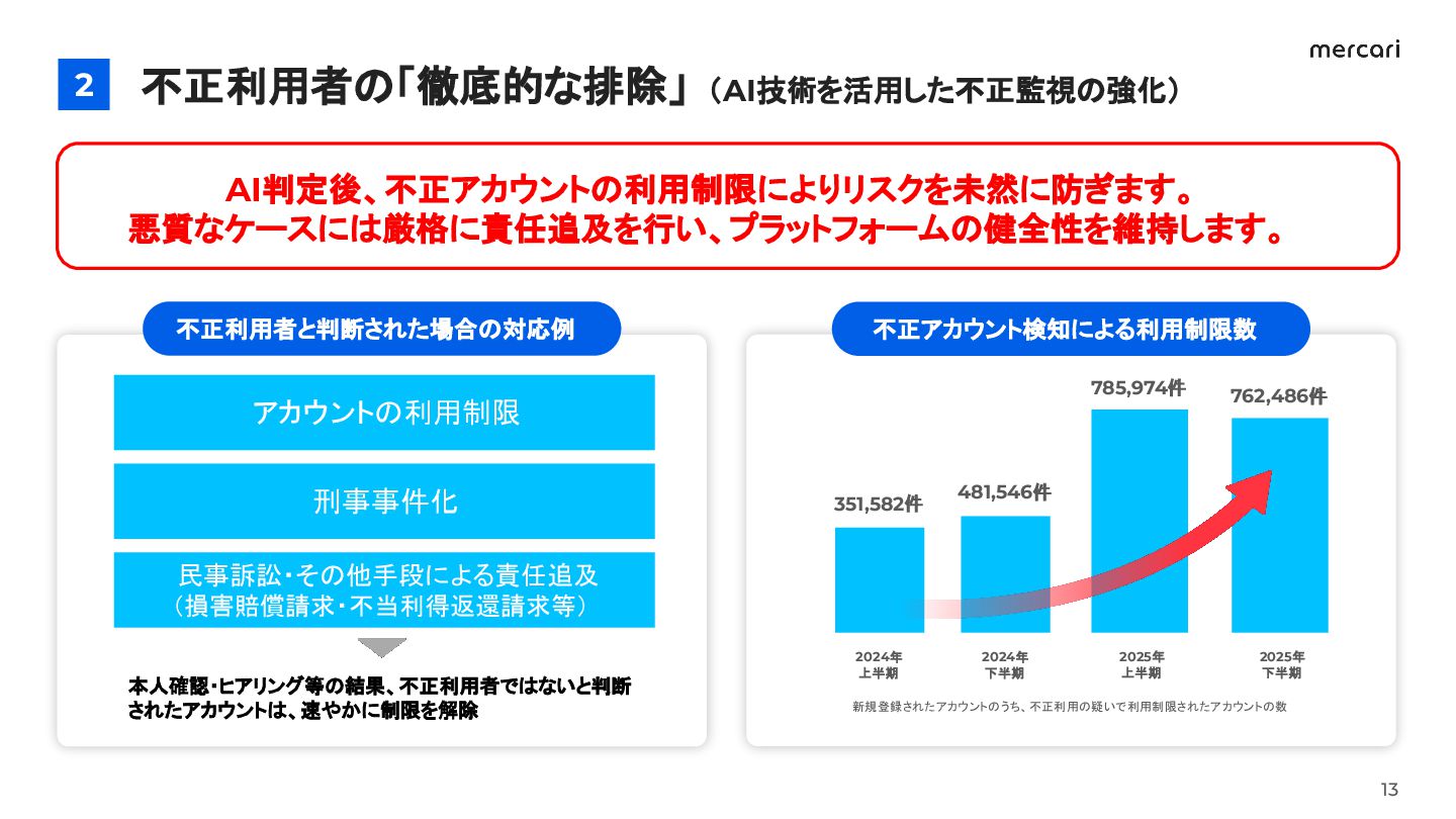 7. 不正利用者の「徹底的な排除」(AI技術を活用した不正監視の強化) 2 13 アカウントの利用制限 刑事事件化 民事訴訟・その他手段による責任追及 (損害賠償請求・不当利得返還請求等) 不正利用者と判断された場合の対応例 不正アカウント検知による利用制限数 本人確認・ヒアリング等の結果、不正利用者ではないと