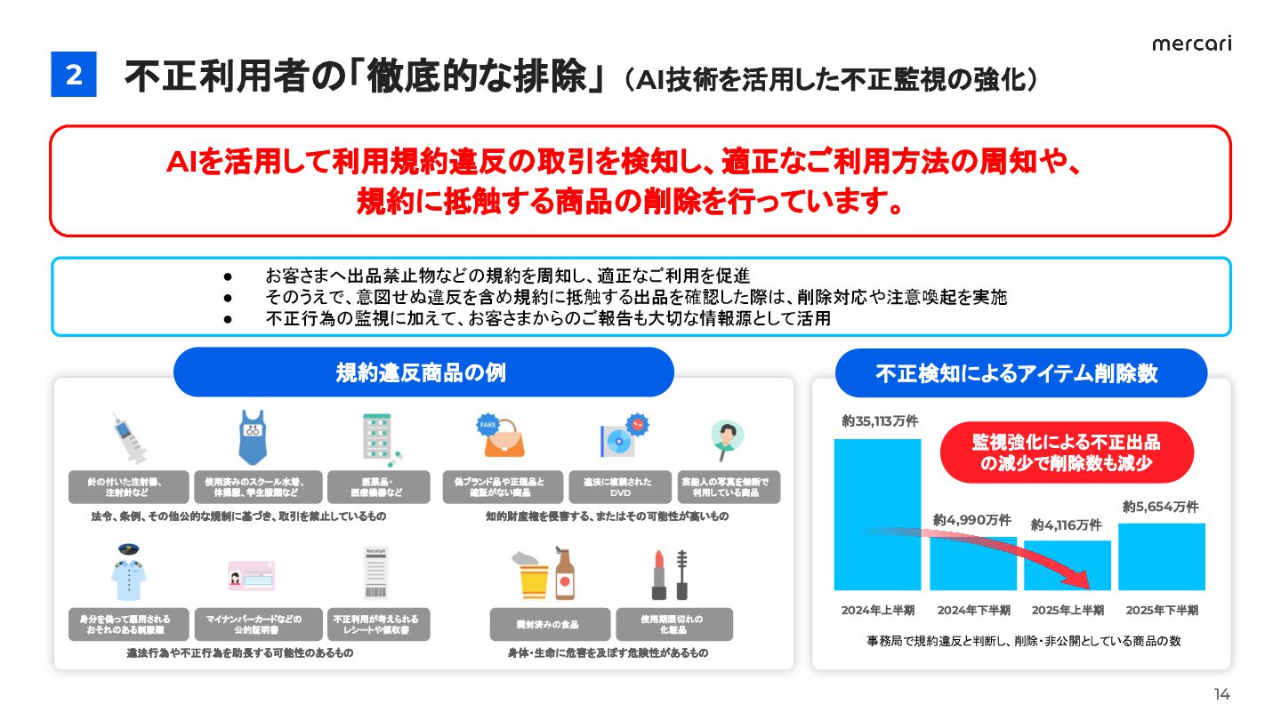 8. • お客さまへ出品禁止物などの規約を周知し、適正なご利用を促進 • そのうえで、意図せぬ違反を含め規約に抵触する出品を確認した際は、削除対応や注意喚起を実施 • 不正行為の監視に加えて、お客さまからのご報告も大切な情報源として活用 不正検知によるアイテム削除数 不正利用者の「徹底的な排除」(AI技術を活用した不正監視の強化) 2 14