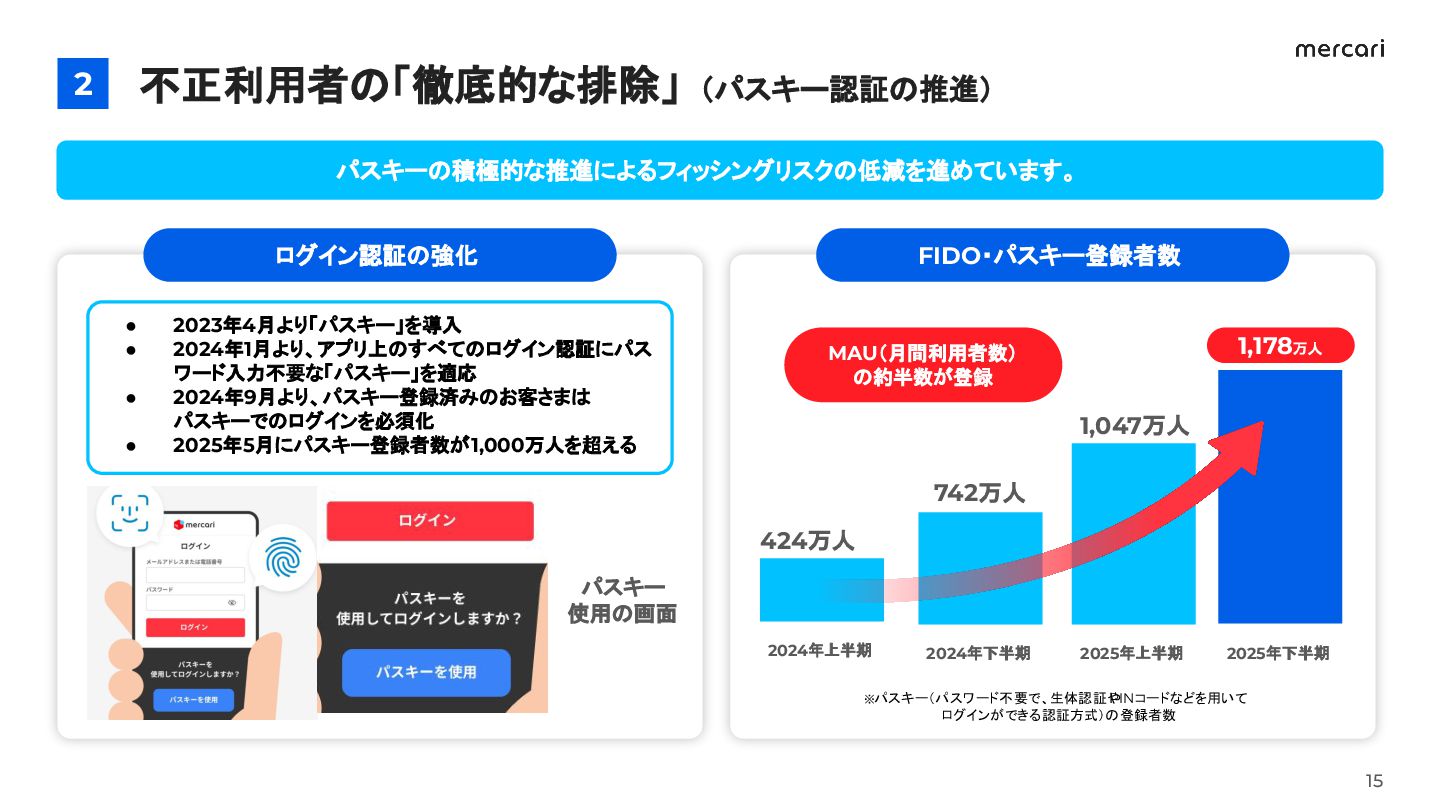 2025年5月にパスキー登録者数が1,000万人を超える パスキー 使用の画面 不正利用者の「徹底的な排除」(パスキー認証の推進) 2 パスキーの積極的な推進によるフィッシングリスクの低減を進めています。 15 FIDO・パスキー登録者数 ※パスキー(パスワード不要で、生体認証や PINコードなどを用いて ログインができる認証方式)の登録者数 2025年上半期 2024年下半期 2024年上半期 1,178万人 1,047万人 742万人 424万人 2025年下半期 MAU(月間利用者数) の約半数が登録