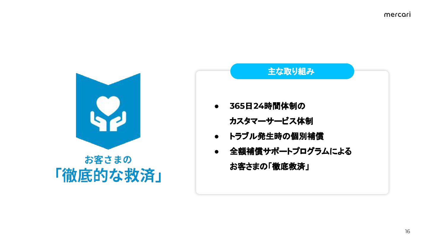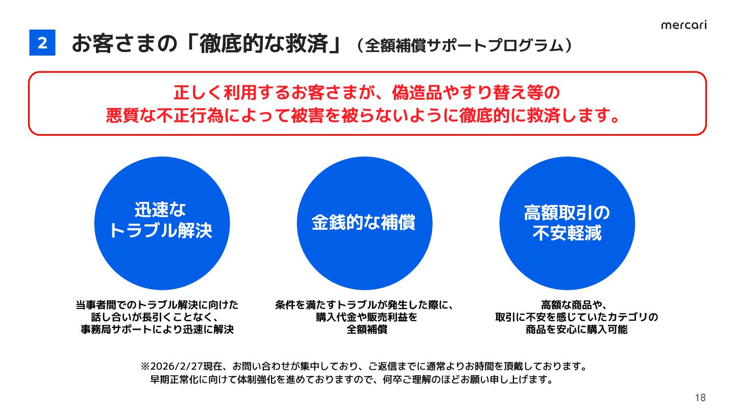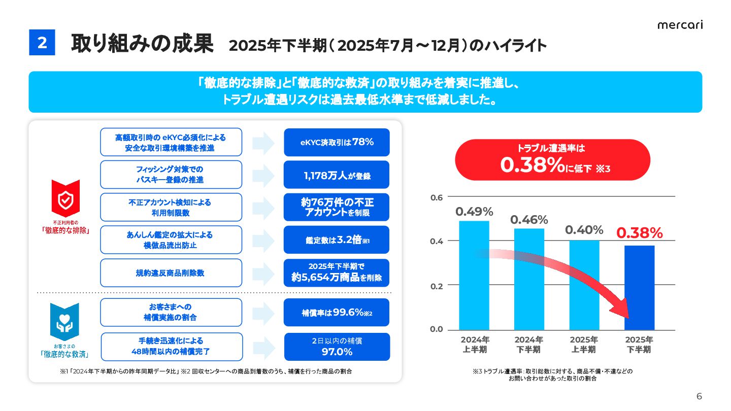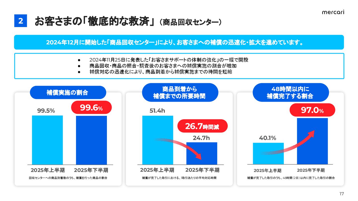 補償実施の割合 商品到着から 補償までの所要時間 48時間以内に 補償完了する割合 99.6% 2025年上半期 2025年下半期 26.7時間減 2025年上半期 2025年下半期 97.0% 2025年上半期 回収センターへの商品到着数のうち、補償を行った商品の割合 補償が完了した取引における、1取引あたりの平均対応時間 補償が完了した取引のうち、48時間(2日)以内に完了した取引の割合 40.1% 2025年下半期 99.5% 51.4h 24.7h