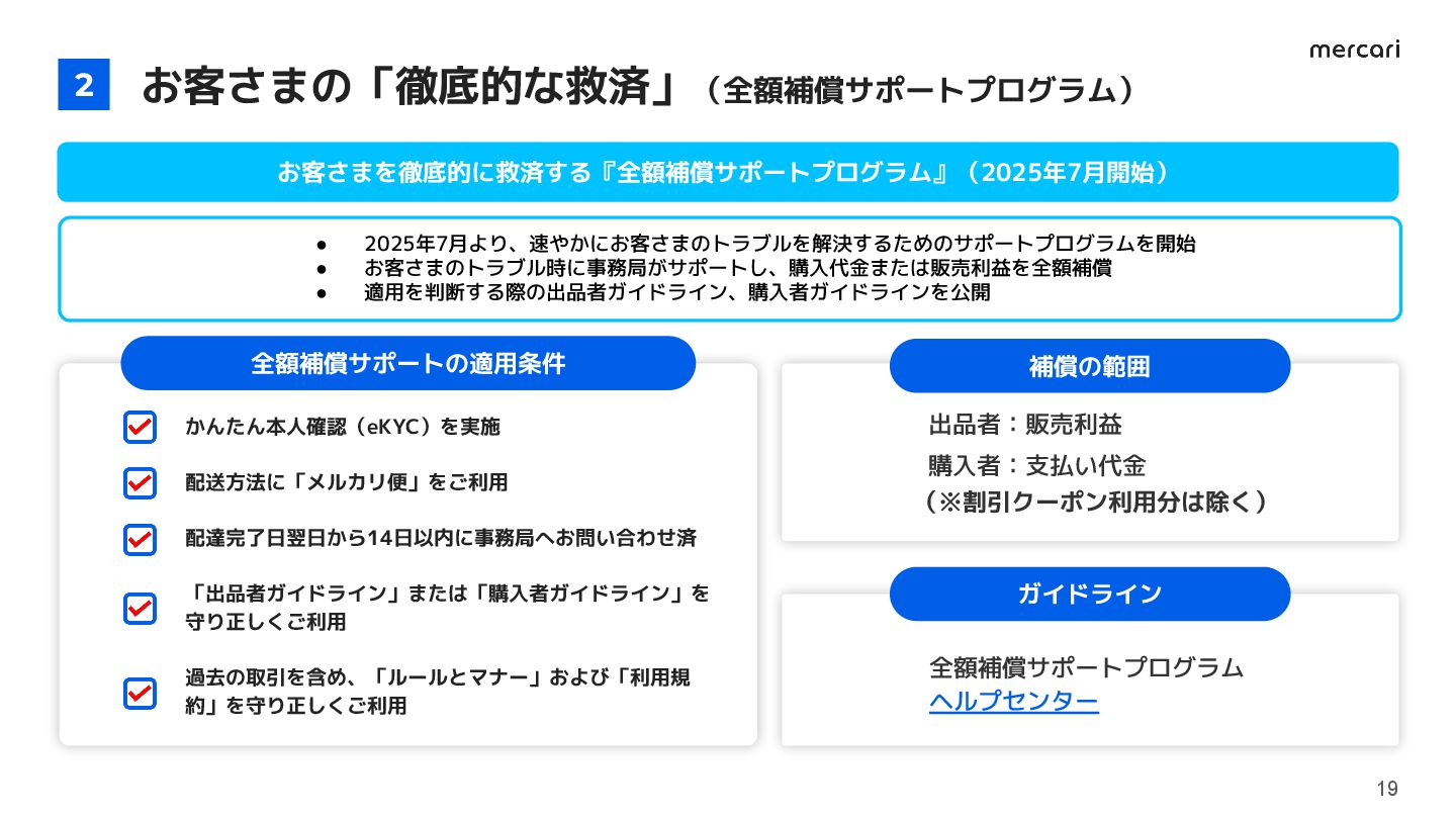 条件を満たすトラブルが発生した際に、 購入代金や販売利益を 全額補償 高額な商品や、 取引に不安を感じていたカテゴリの 商品を安心に購入可能 18 ※2026/2/27現在、お問い合わせが集中しており、ご返信までに通常よりお時間を頂戴しております。  早期正常化に向けて体制強化を進めておりますので、何卒ご理解のほどお願い申し上げます。 正しく利用するお客さまが、偽造品やすり替え等の 悪質な不正行為によって被害を被らないように徹底的に救済します。