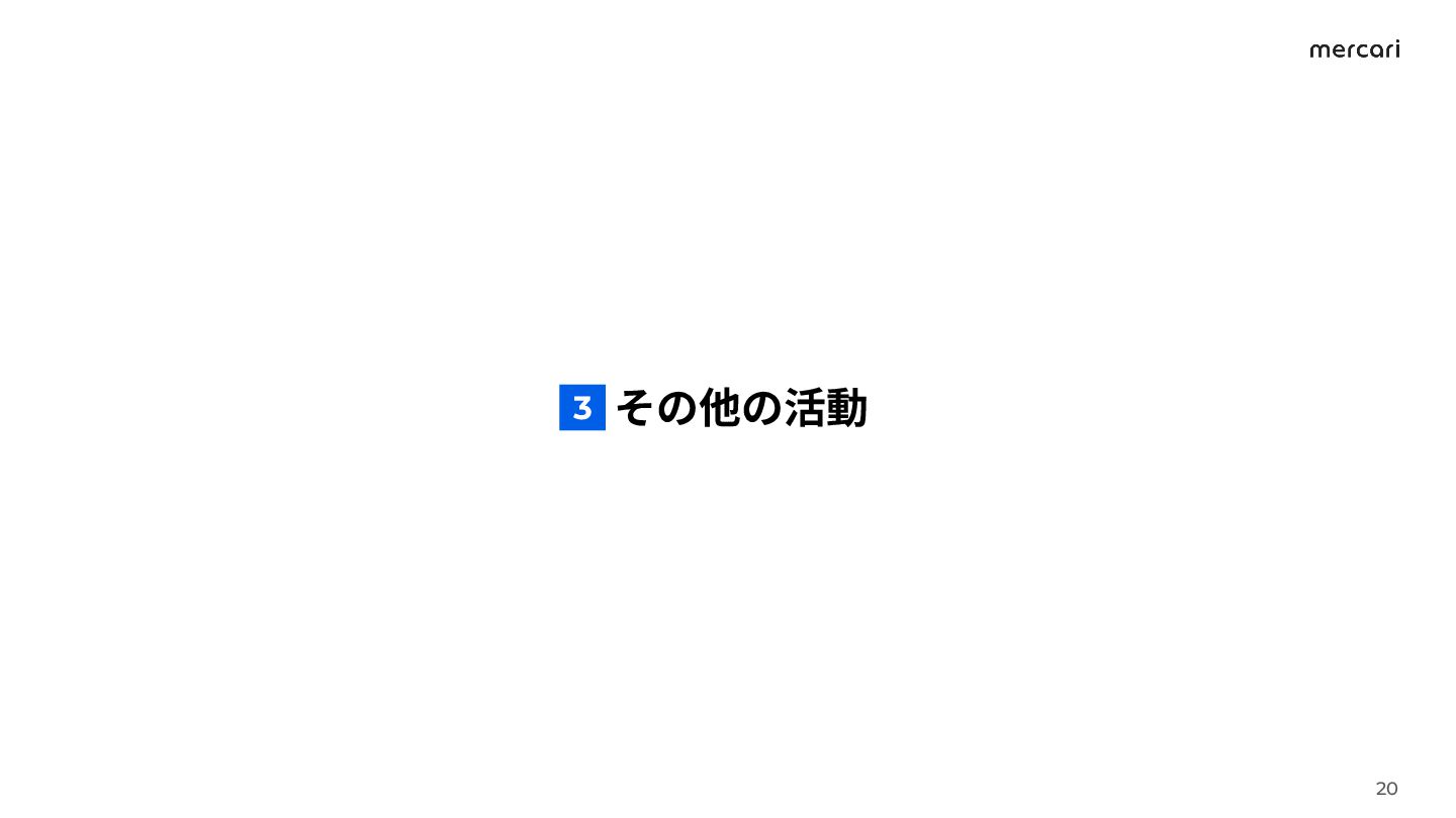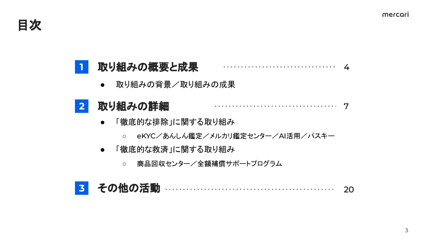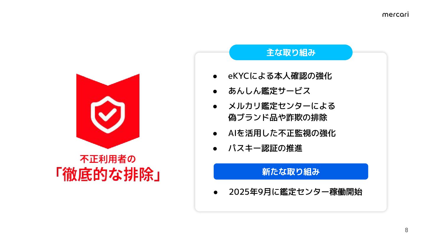 「徹底的な排除」に関する取り組み ◦ eKYC/あんしん鑑定/メルカリ鑑定センター/AI活用/パスキー • 「徹底的な救済」に関する取り組み ◦ 商品回収センター/全額補償サポートプログラム 4 7 20 3