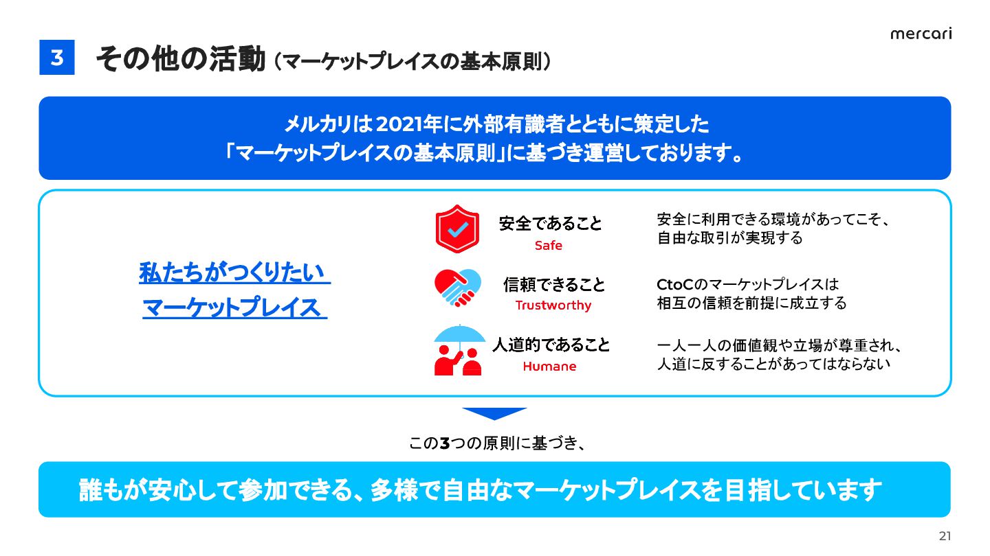 13. マーケットプレイスの安心・安全を確保できるように 基本原則の枠外で、個別の事案に対する出品禁止措置等を行う方針に 議論の結果、「安心・安全」の重要性を再確認 その他の活動(マーケットプレイスの基本原則) 3 22 「第5回マーケットプレイスのあり方に関するアドバイザリーボード」の議事概要 https://about.mercari.com/press/news/articles/20251009_advisoryboard/ 基本原則で規制できない商品に起因して、 マーケットプレイス内の安心・安全が著しく損なわれる可能性