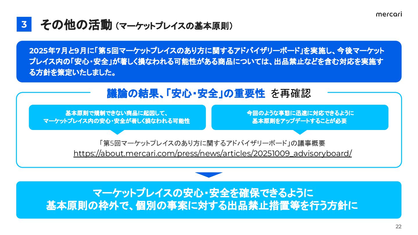 2025年7月と9月に「第5回マーケットプレイスのあり方に関するアドバイザリーボード」を実施し、今後 マーケットプレイス内の「安心・安全」が著しく損なわれる可能性がある商品については、出品禁止など を含む対応を実施する方針を策定いたしました。 今回のような事態に迅速に対応できるように 基本原則をアップデートすることが必要