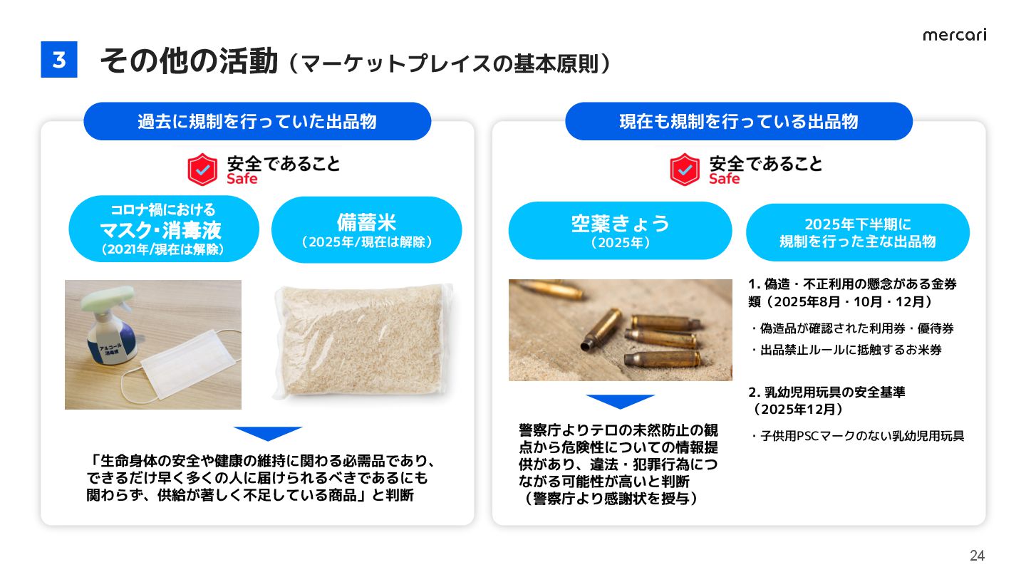 (2025年/現在は解除) 現在も規制を行っている出品物 警察庁よりテロの未然防止の観 点から危険性についての情報提 供があり、違法・犯罪行為につ ながる可能性が高いと判断 (警察庁より感謝状を授与) 空薬きょう (2025年) 2025年下半期に 規制を行った主な出品物 1. 偽造・不正利用の懸念がある金券 類(2025年8月・10月・12月) ・偽造品が確認された利用券・優待券 ・出品禁止ルールに抵触するお米券 2. 乳幼児用玩具の安全基準 (2025年12月) ・子供用PSCマークのない乳幼児用玩具 24