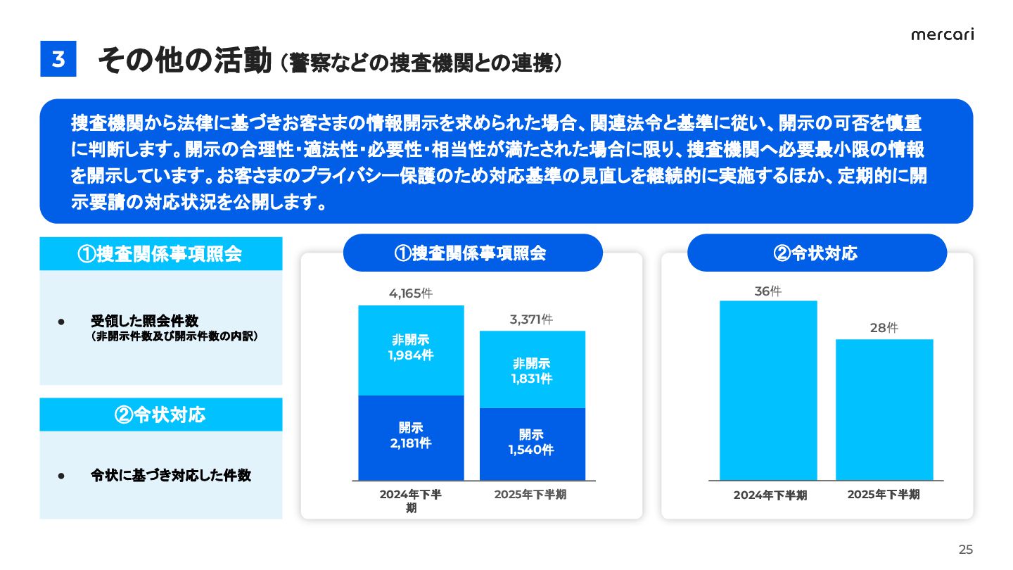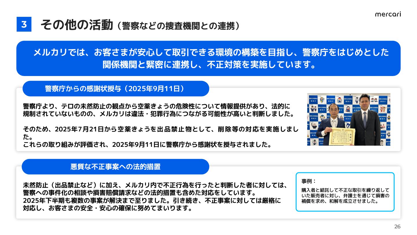 16. その他の活動(警察などの捜査機関との連携) 3 メルカリでは、お客さまが安心して取引できる環境の構築を目指し、警察庁をはじめとした 関係機関と緊密に連携し、不正対策を実施しています。 26 未然防止(出品禁止など)に加え、メルカリ内で不正行為を行ったと判断した者に対しては、 警察への事件化の相談や損害賠償請求などの法的措置も含めた対応をしています。 2025年下半期も複数の事案が解決まで至りました。引き続き、不正事案に対しては厳格に 対応し、お客さまの安全・安心の確保に努めてまいります。 警察庁からの感謝状授与(2025年9月11日)