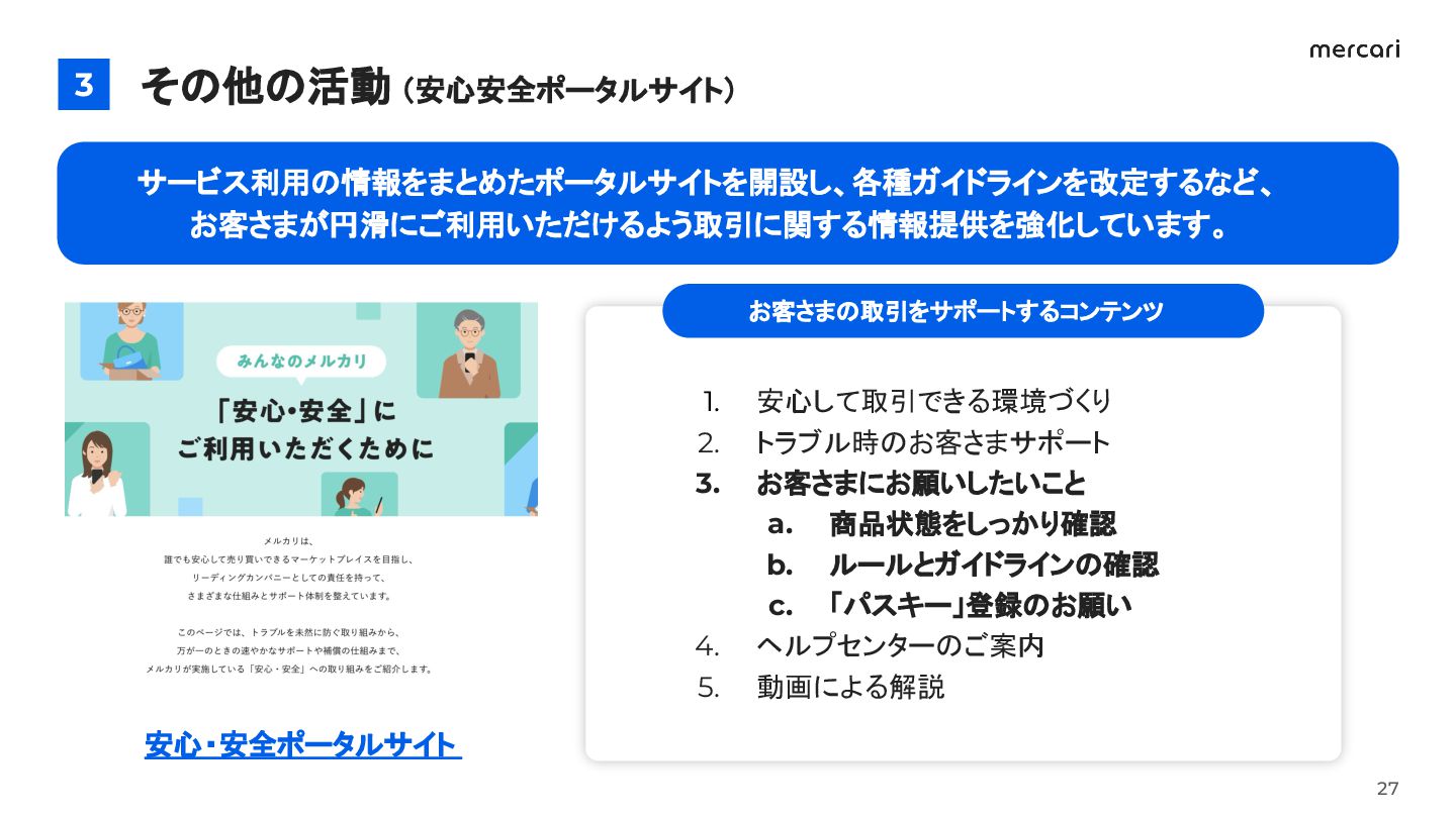 a. 商品状態をしっかり確認 b. ルールとガイドラインの確認 c. 「パスキー」登録のお願い 4. ヘルプセンターのご案内 5. 動画による解説 27 サービス利用の情報をまとめたポータルサイトを開設し、各種ガイドラインを改定するなど、 お客さまが円滑にご利用いただけるよう取引に関する情報提供を強化しています。