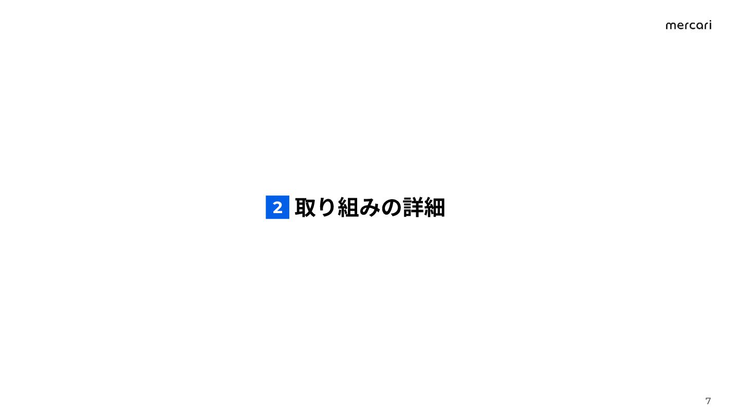 2025年下半期で 約5,654万商品を削除 約76万件の不正 アカウントを制限 鑑定数は3.2倍※1 高額取引時のeKYC必須化による 安全な取引環境構築を推進 不正アカウント検知による 利用制限数 あんしん鑑定の拡大による 模倣品流出防止 規約違反商品削除数 eKYC済取引は78% 補償率は99.6%※2 お客さまへの 補償実施の割合 手続き迅速化による 48時間以内の補償完了 2日以内の補償 97.0% ※3 トラブル遭遇率:取引総数に対する、商品不備・不達などの お問い合わせがあった取引の割合 2024年 上半期 0.49% トラブル遭遇率は 0.38%に低下 ※3 0.0 0.2 0.4 0.6 0.46% 0.40% 2024年 下半期 2025年 上半期 2025年 下半期 0.38% 6 ※1 「2024年下半期からの昨年同期データ比」 ※2 回収センターへの商品到着数のうち、補償を行った商品の割合