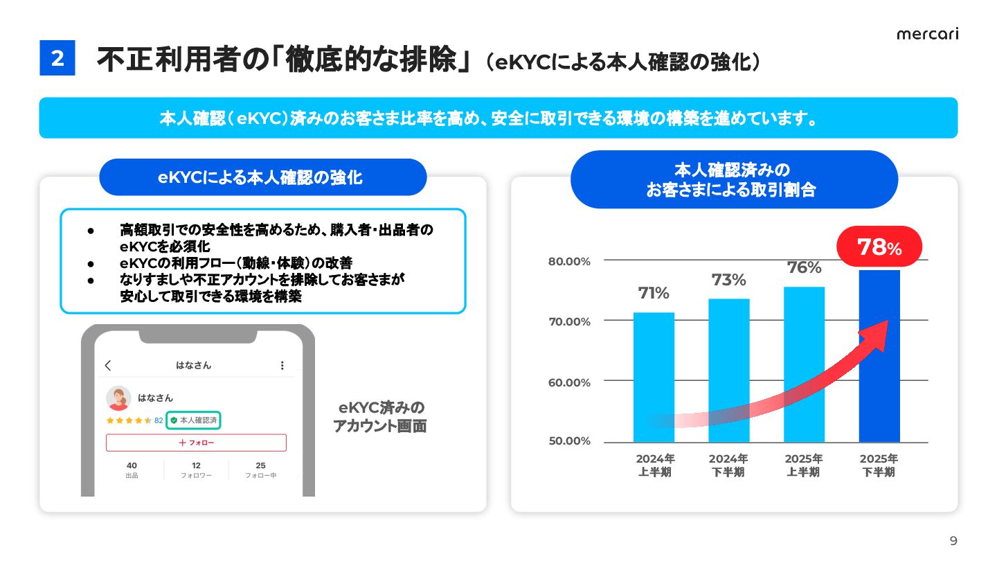 4. 不正利用者の「徹底的な排除」(eKYCによる本人確認の強化) 2 本人確認(eKYC)済みのお客さま比率を高め、安全に取引できる環境の構築を進めています。 eKYCによる本人確認の強化 本人確認済みの お客さまによる取引割合 • 高額取引での安全性を高めるため、購入者・出品者の eKYCを必須化 •