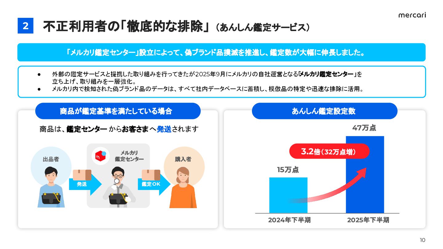 6. 鑑定業務をメルカリで内製化し、カスタマーサポートと連携して健全な取引を確保 不正利用者の「徹底的な排除」(メルカリ鑑定センター) 2 2025年9月 開始 偽ブランド品や詐欺を水際で食い止めるため、メルカリの安全を守る防衛ラインを構築しています。 • 自社運営の鑑定センターを設けることで、偽ブランド品やすり替え詐欺の撲滅を目指す • 外部委託から自社運営に切り替え、鑑定対象の拡大や一部商品の鑑定義務化を検討