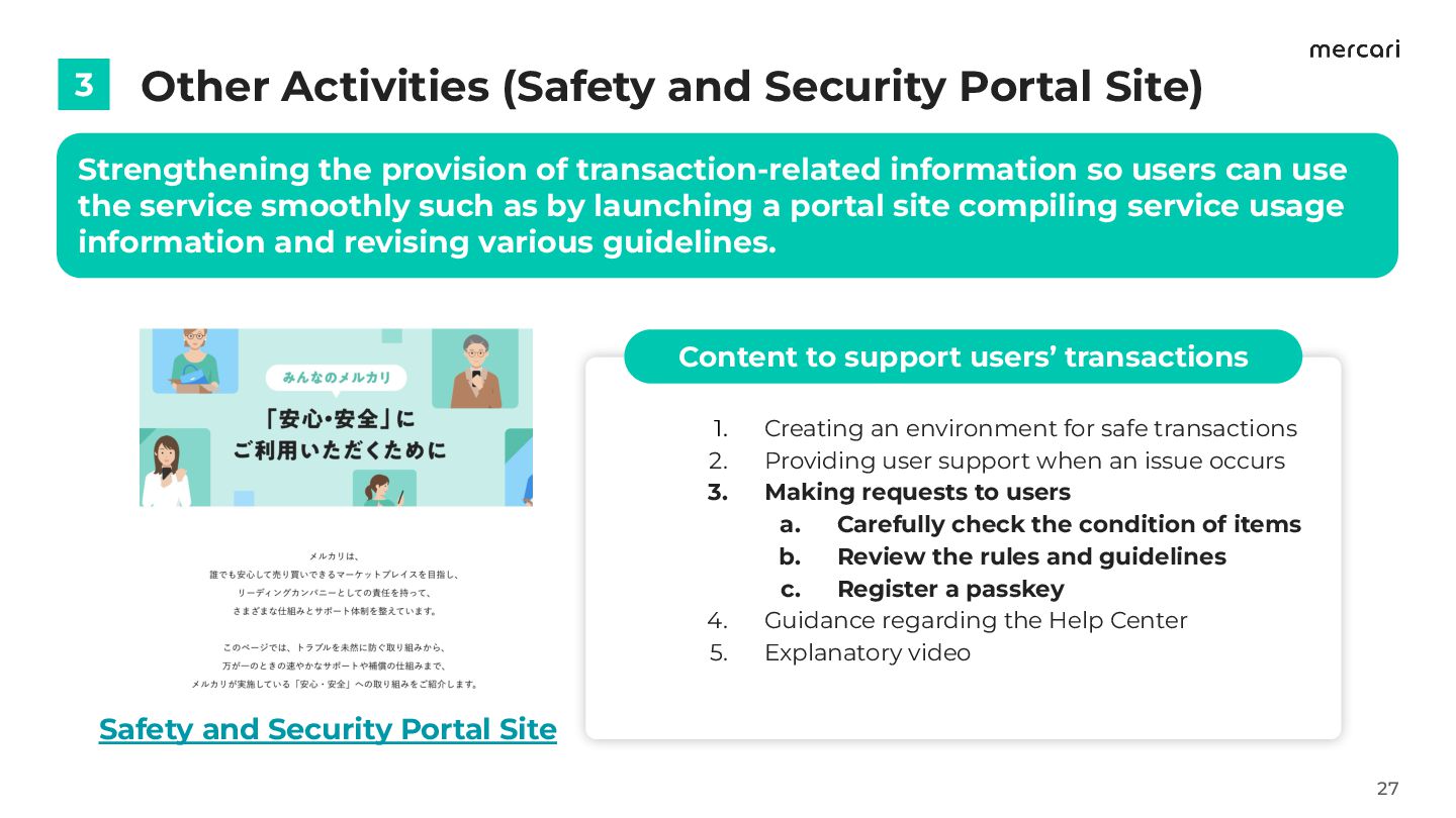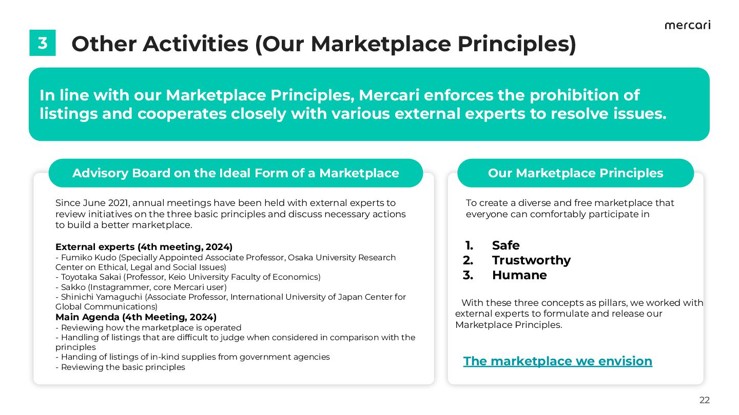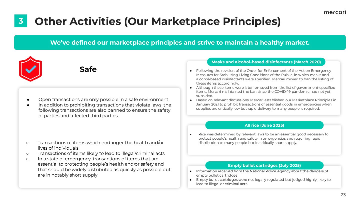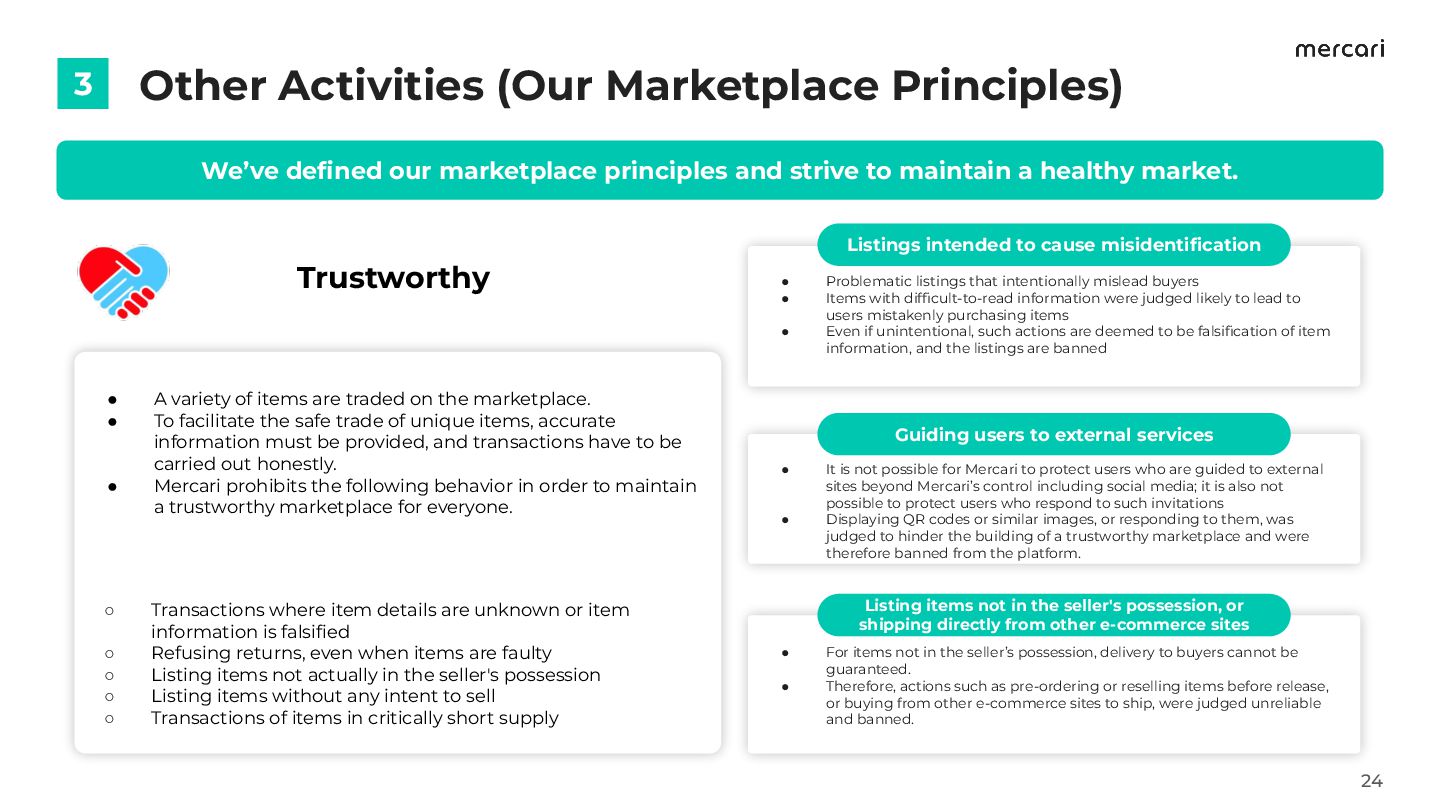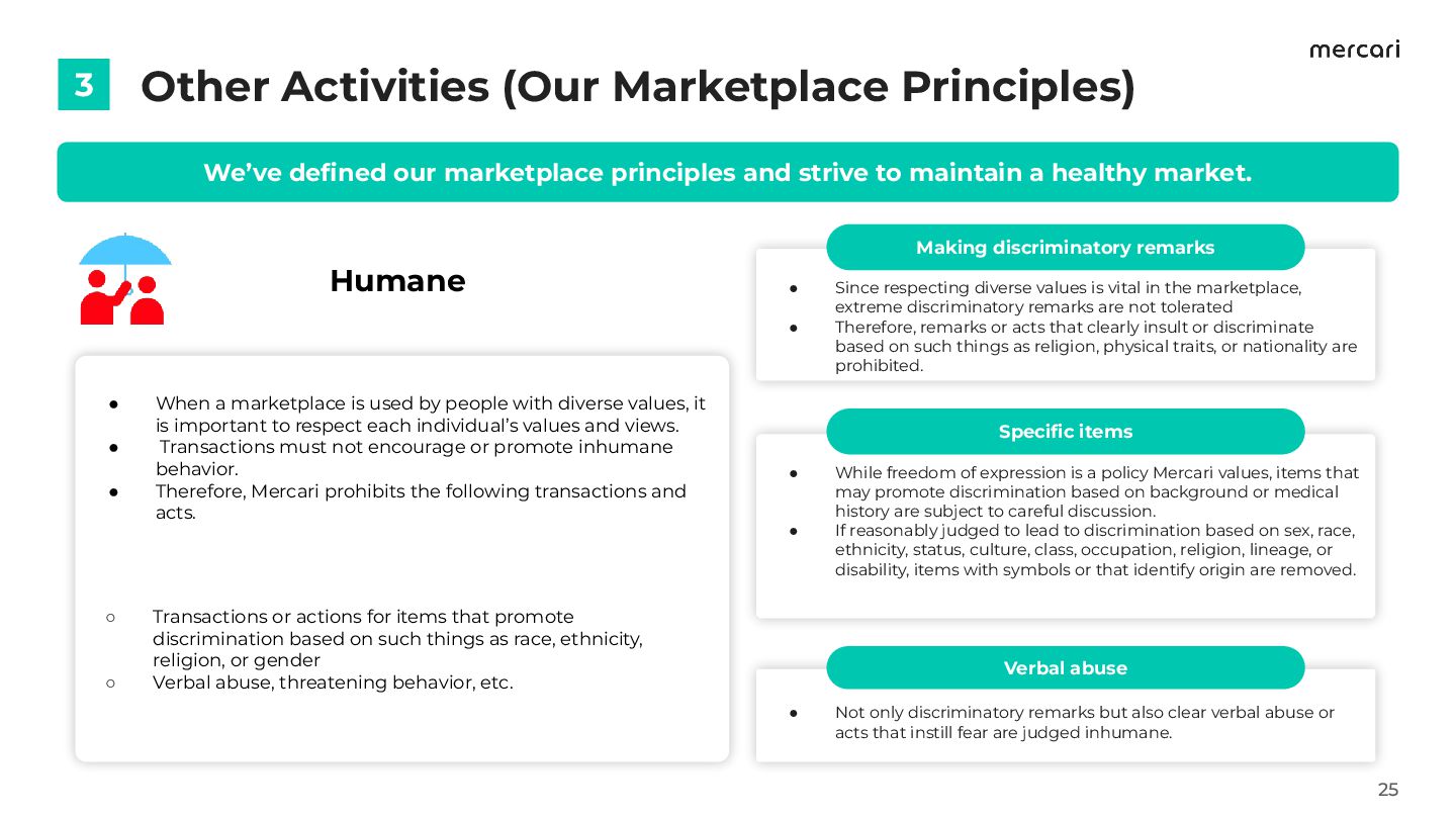 principles and strive to maintain a healthy market. • When a marketplace is used by people with diverse values, it is important to respect each individual’s values and views. • Transactions must not encourage or promote inhumane behavior. • Therefore, Mercari prohibits the following transactions and acts. ◦ Transactions or actions for items that promote discrimination based on such things as race, ethnicity, religion, or gender ◦ Verbal abuse, threatening behavior, etc. Making discriminatory remarks • Since respecting diverse values is vital in the marketplace, extreme discriminatory remarks are not tolerated • Therefore, remarks or acts that clearly insult or discriminate based on such things as religion, physical traits, or nationality are prohibited. Specific items • While freedom of expression is a policy Mercari values, items that may promote discrimination based on background or medical history are subject to careful discussion. • If reasonably judged to lead to discrimination based on sex, race, ethnicity, status, culture, class, occupation, religion, lineage, or disability, items with symbols or that identify origin are removed. Humane Verbal abuse • Not only discriminatory remarks but also clear verbal abuse or acts that instill fear are judged inhumane. 25