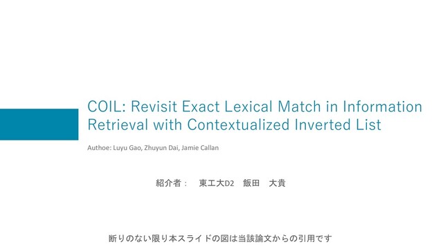 SNLI2021での論文紹介スライドです。NACCL2021の論文、COIL: Revisit Exact Lexical Match in Information Retrieval with Contextualized Inverted Listを紹介しています。