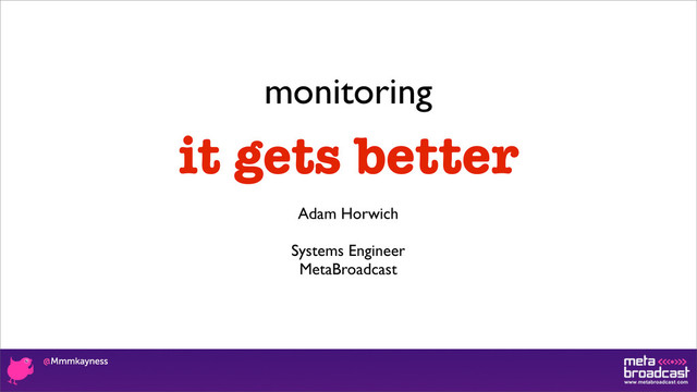 static, rented/owned Datacentre • Started at MetaBroadcast and spent my time hacking Nagios to play well with AWS • We knew what we needed in terms of quality monitoring but it was uphill struggle • Automated infra changes • Metrics gathering and graphing • I cry