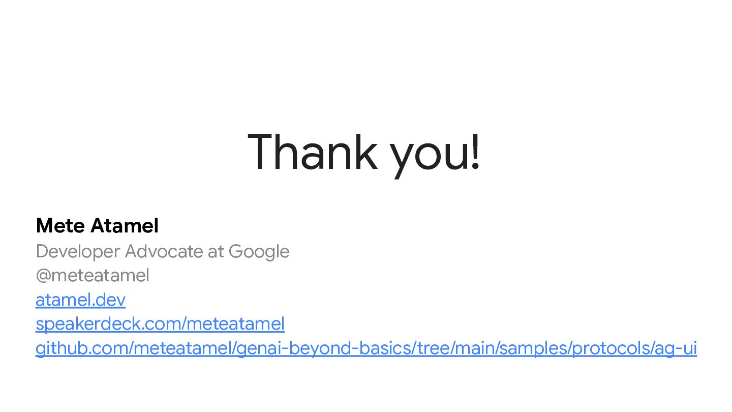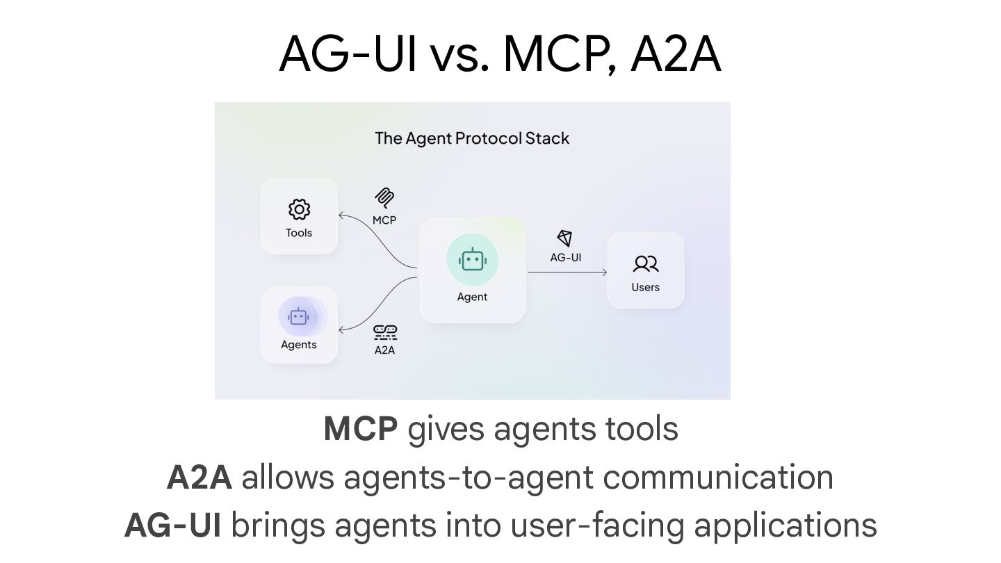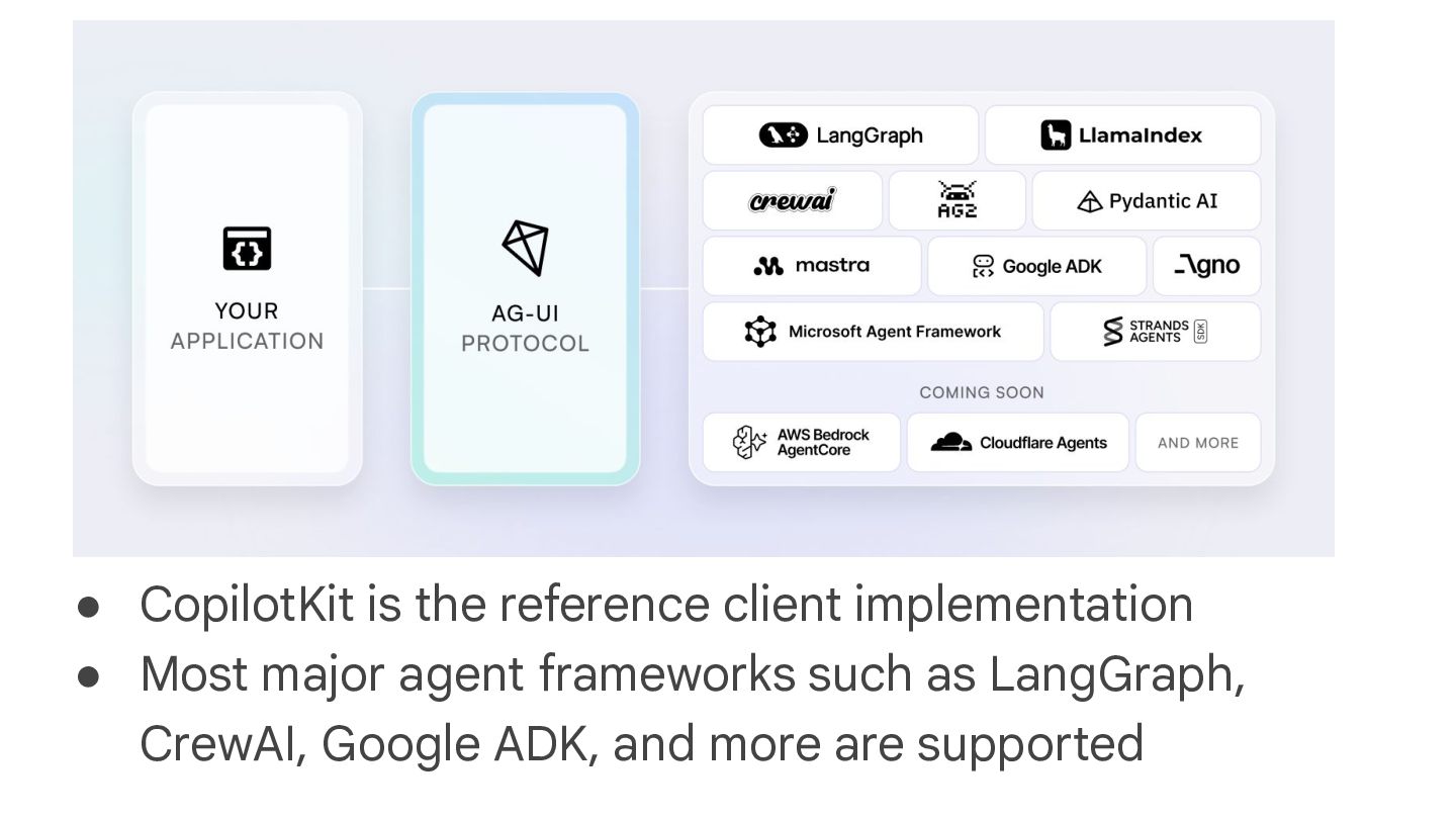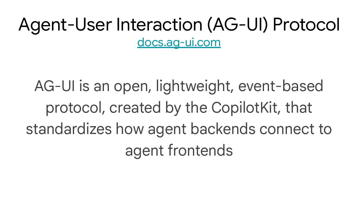 execution • Bidirectional Interaction: Agents accept input from users, enabling collaborative workflows with humans • Transport Agnostic: AG-UI doesn’t mandate how events are delivered, supporting various transport mechanisms including Server-Sent Events (SSE), webhooks, WebSockets, and more Main Benefits