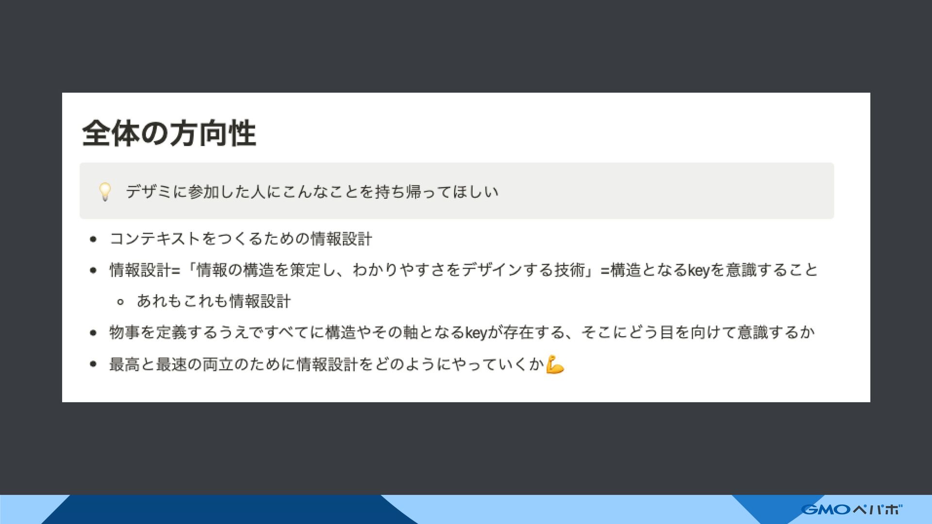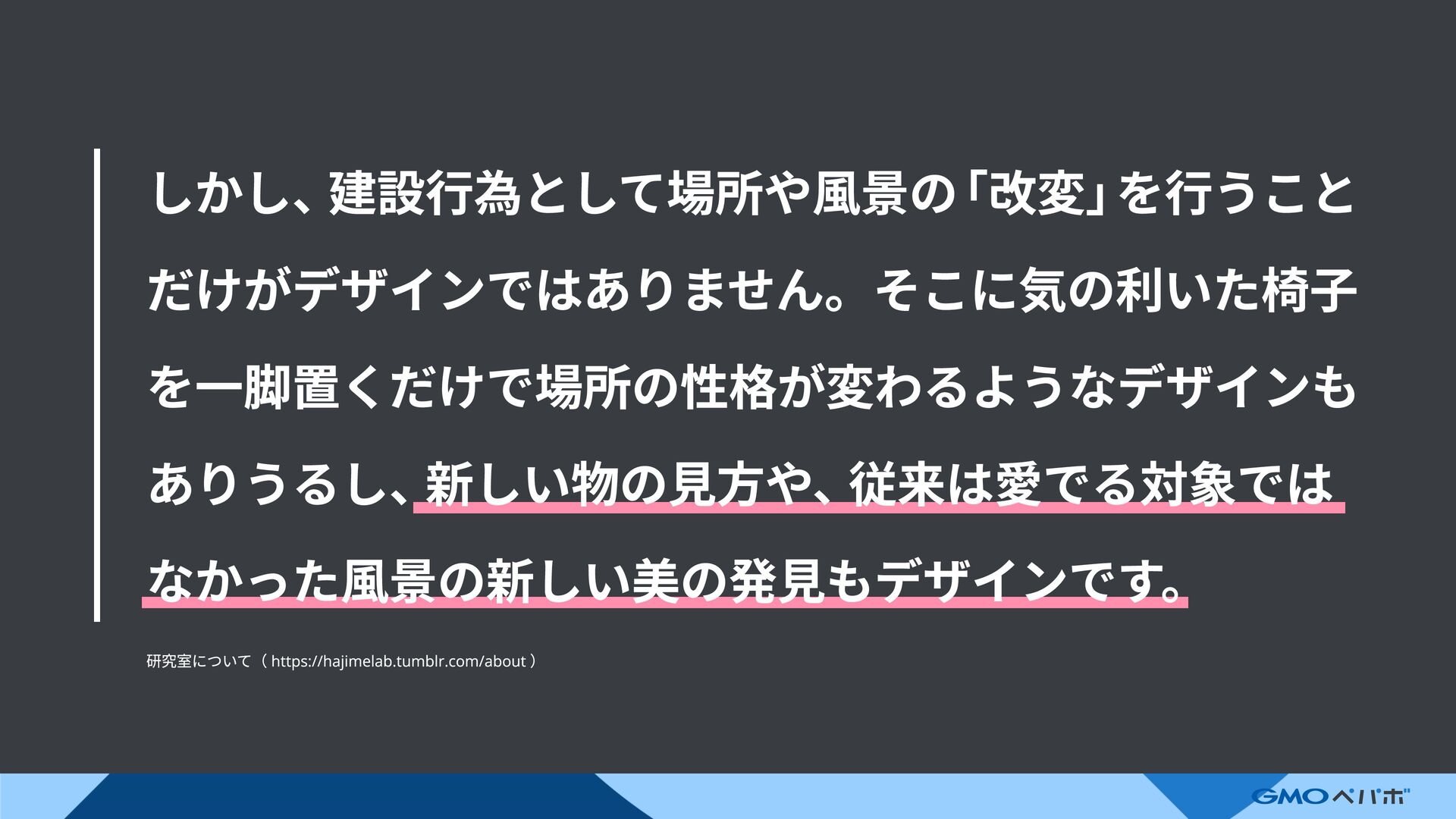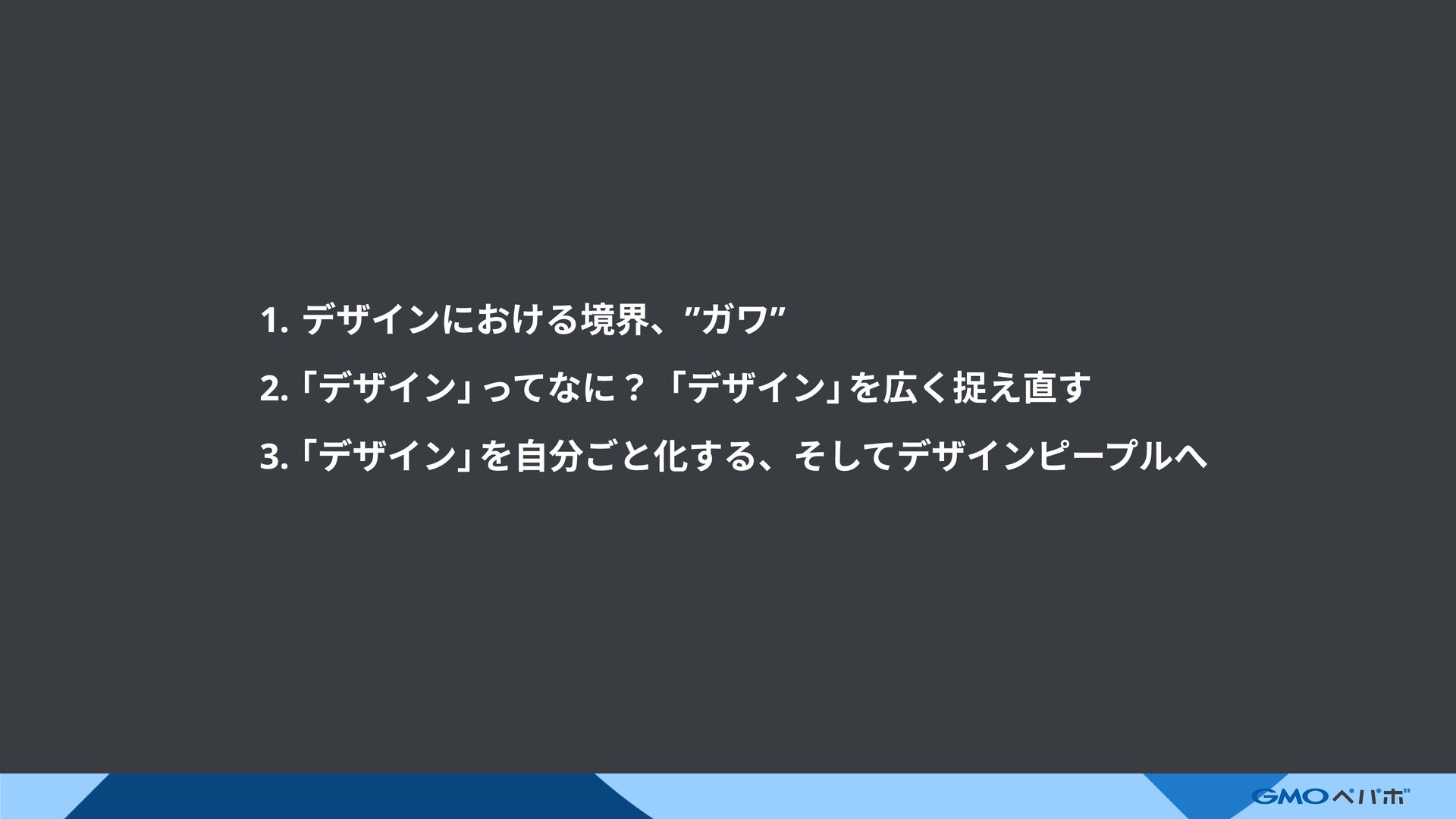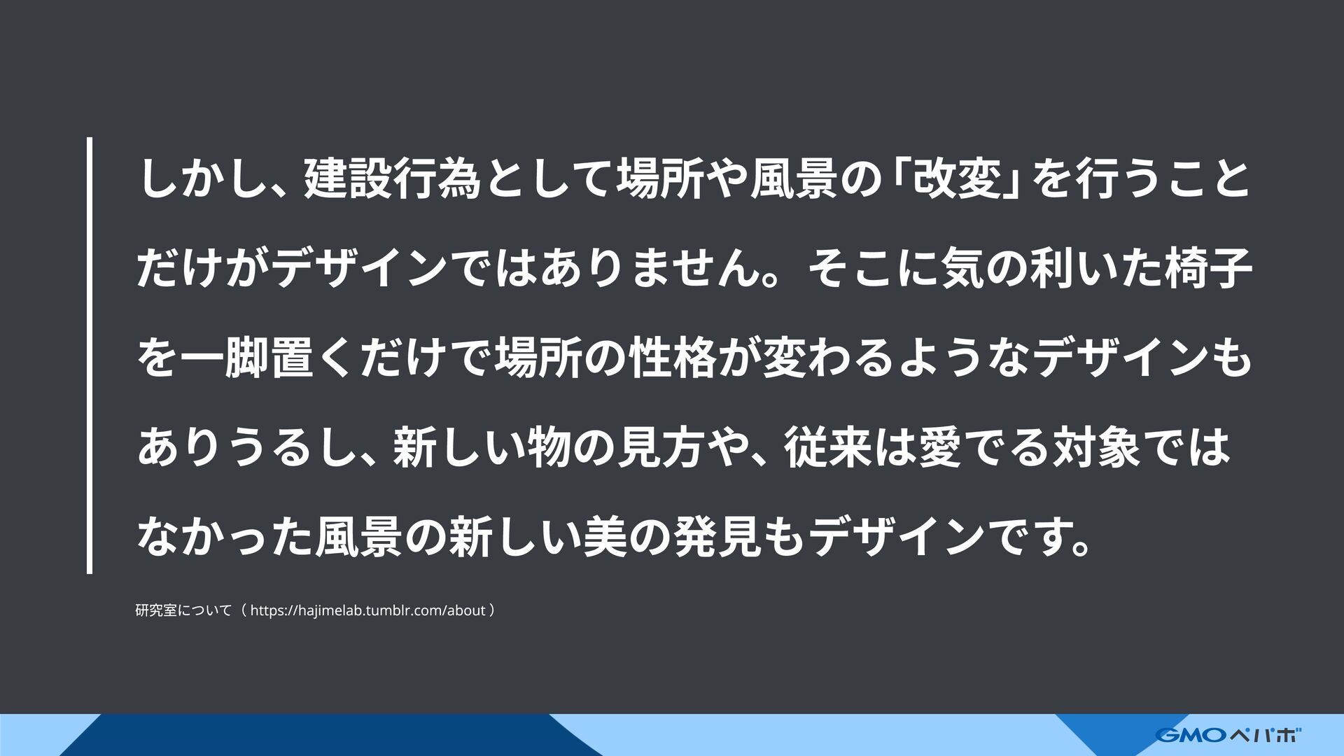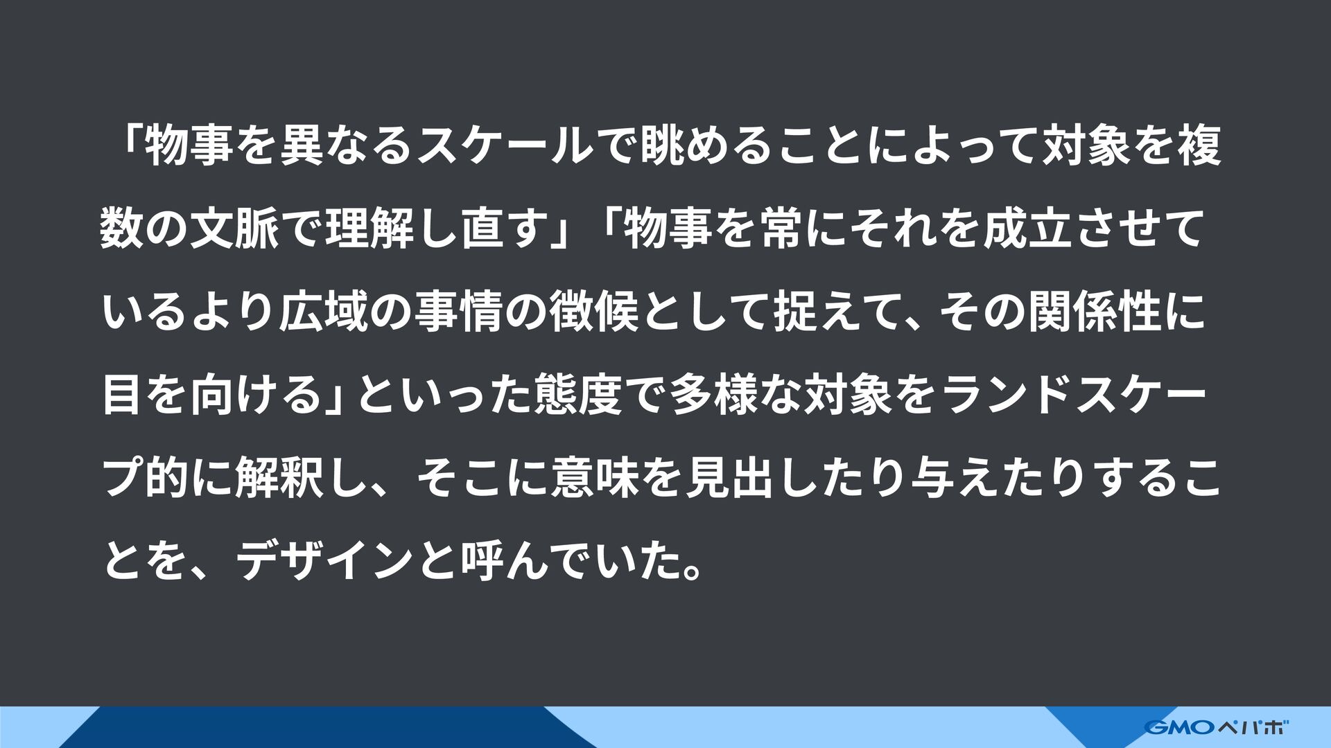 「デザインを自分ごと化するために、まず広くデザインを捉える」ことにフォーカスを当て、その考え方のルーツとなっている自身の出身研究室の取り組みの紹介を交えながら、あらためてデザインとはなにか、を問うような内容になっています。