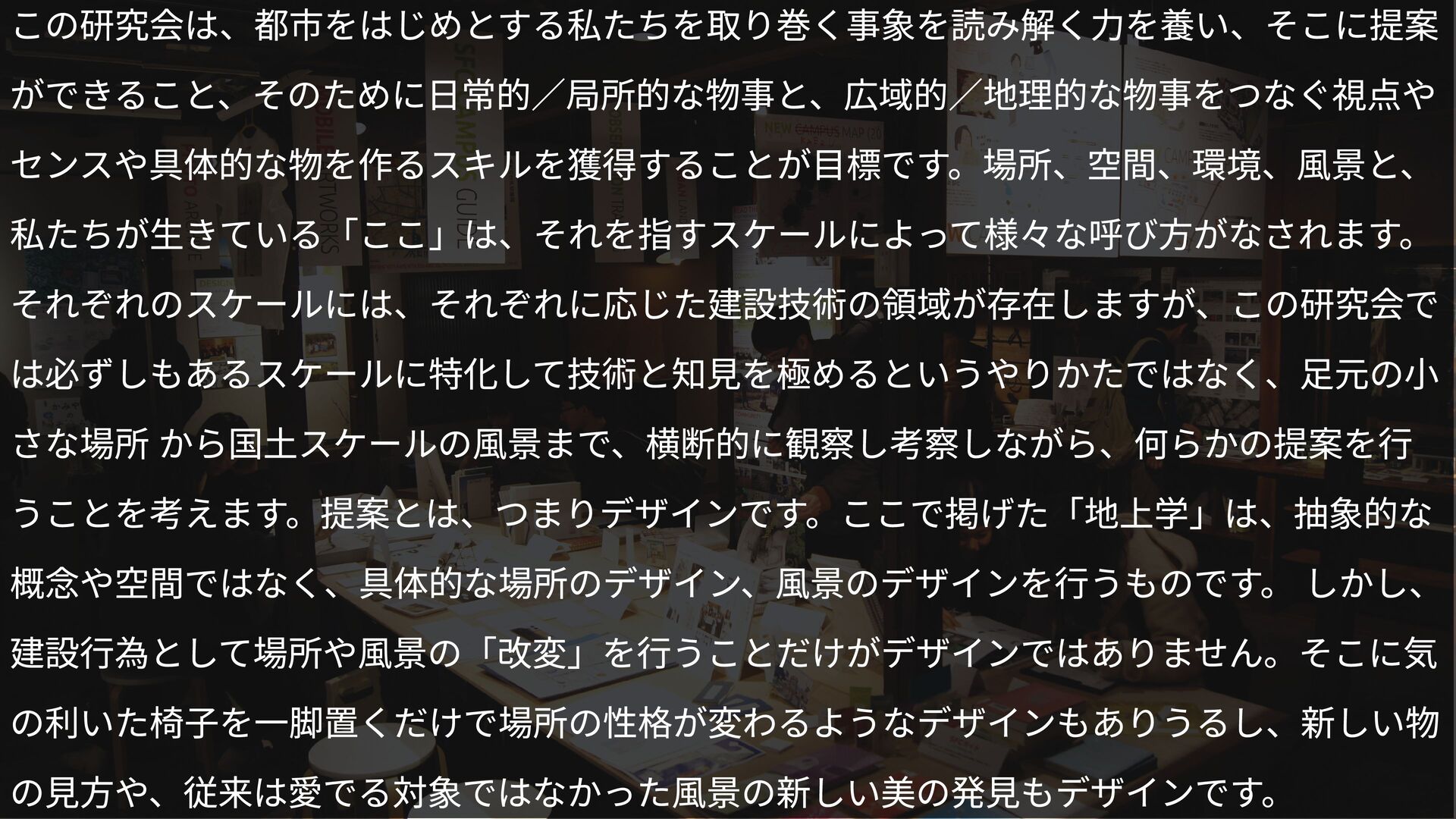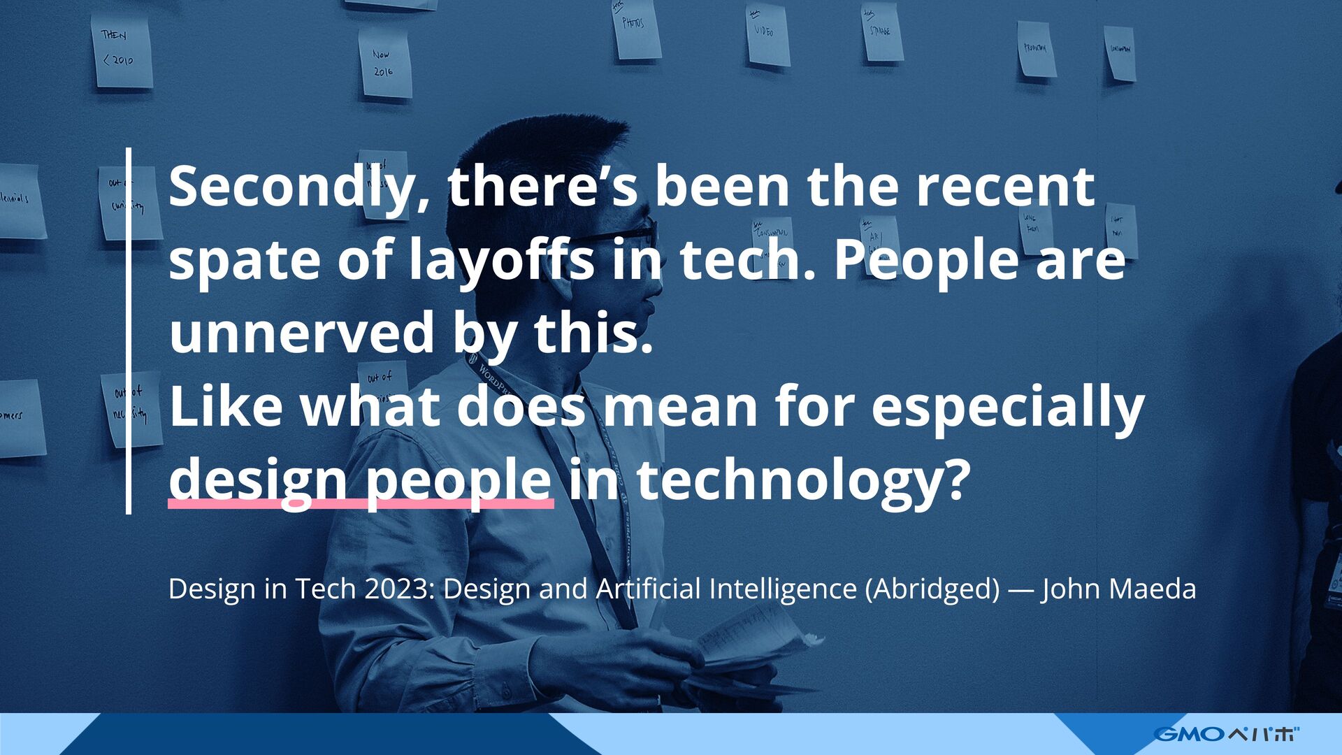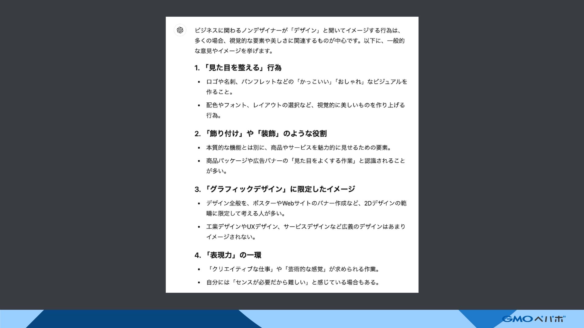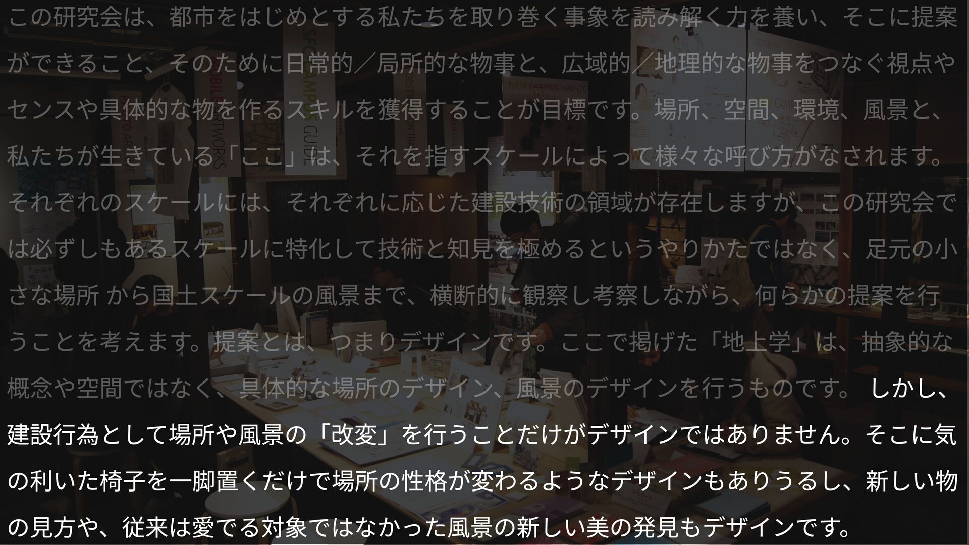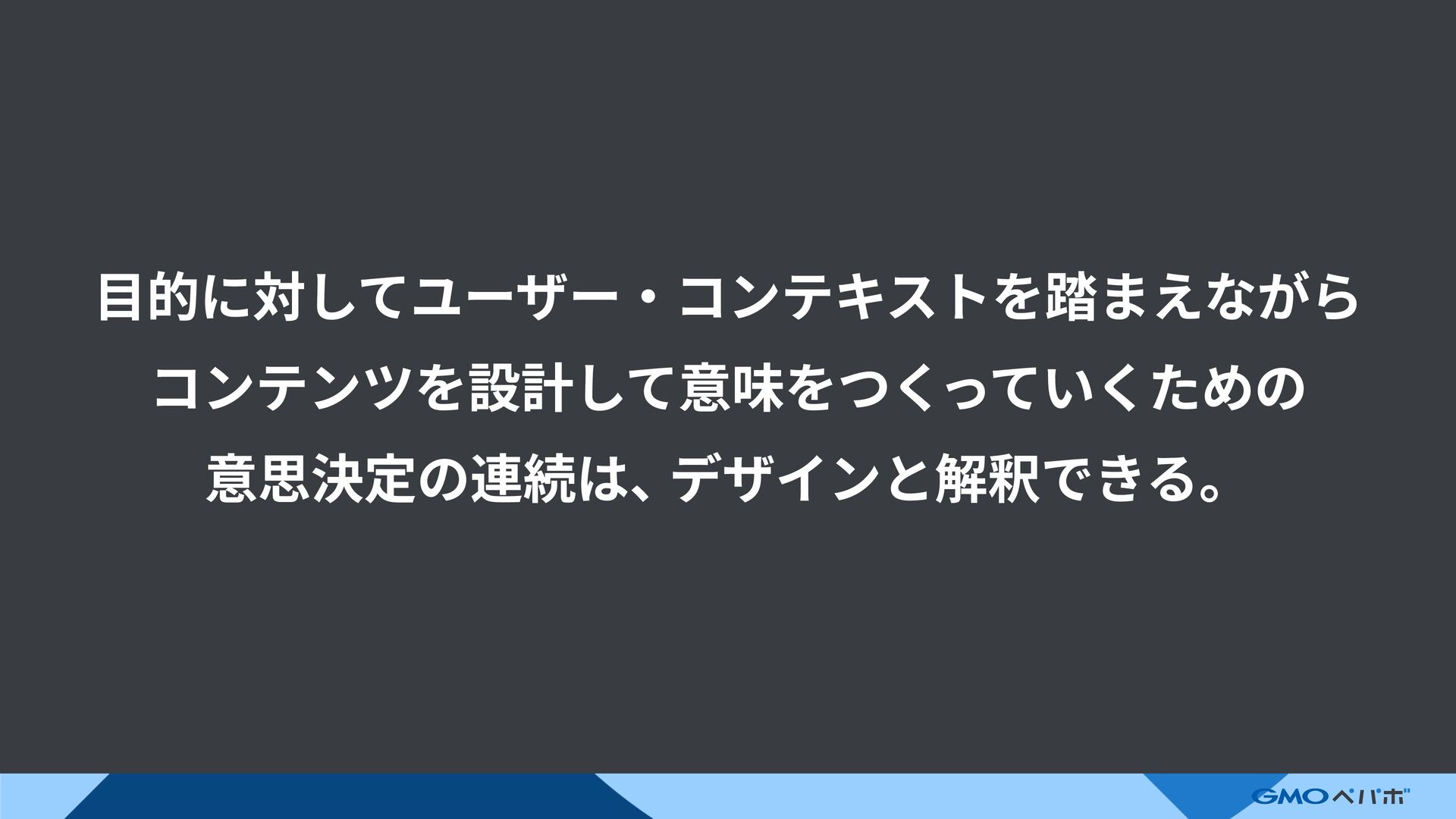 「デザインを自分ごと化するために、まず広くデザインを捉える」ことにフォーカスを当て、その考え方のルーツとなっている自身の出身研究室の取り組みの紹介を交えながら、あらためてデザインとはなにか、を問うような内容になっています。