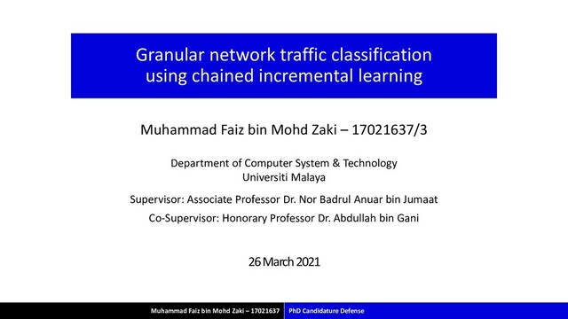 17021637 Granular network traffic classification using chained incremental learning Muhammad Faiz bin Mohd Zaki – 17021637/3 Department of Computer System & Technology Universiti Malaya Supervisor: Associate Professor Dr. Nor Badrul Anuar bin Jumaat Co-Supervisor: Honorary Professor Dr. Abdullah bin Gani 26 March 2021