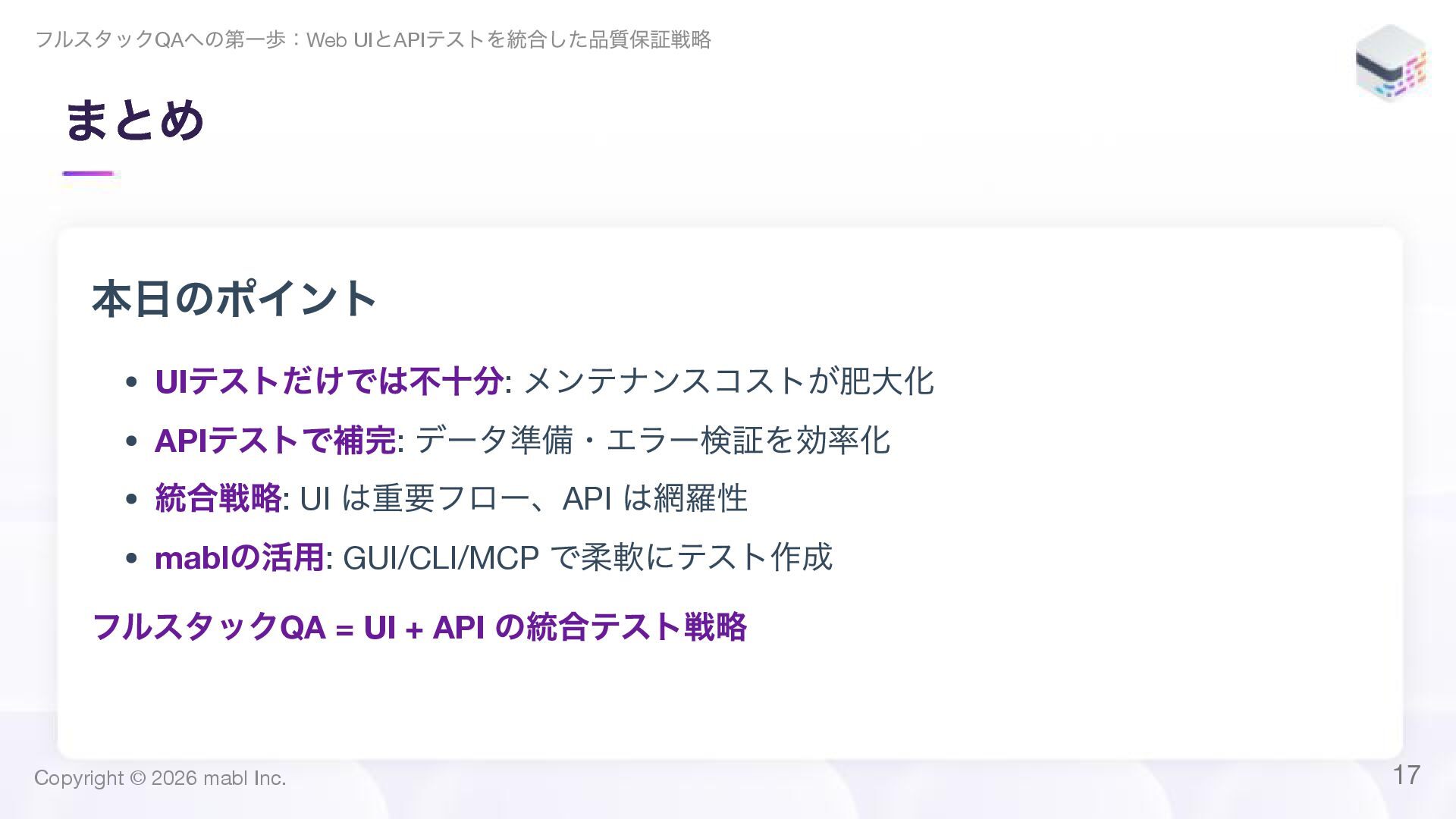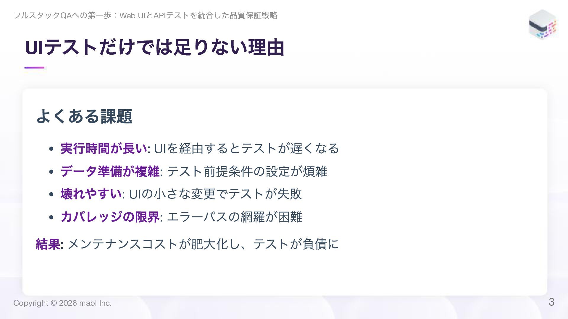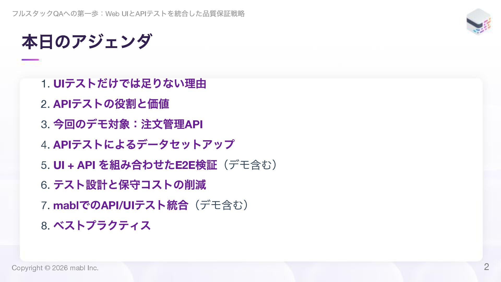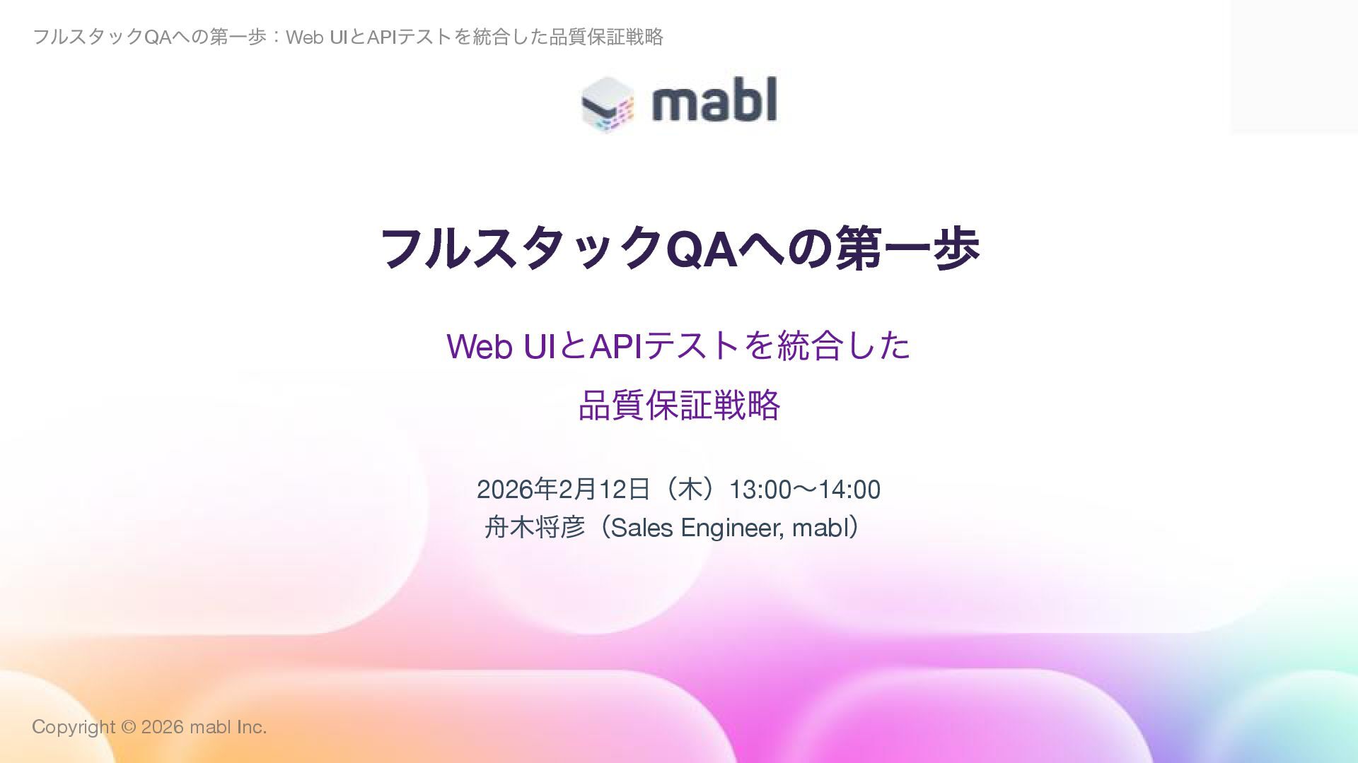 2026/02/12に開催した mabl のウェビナー「フルスタックQAへの第一歩。Web UIとAPIテストを統合した品質保証戦略」で使用したスライドです。