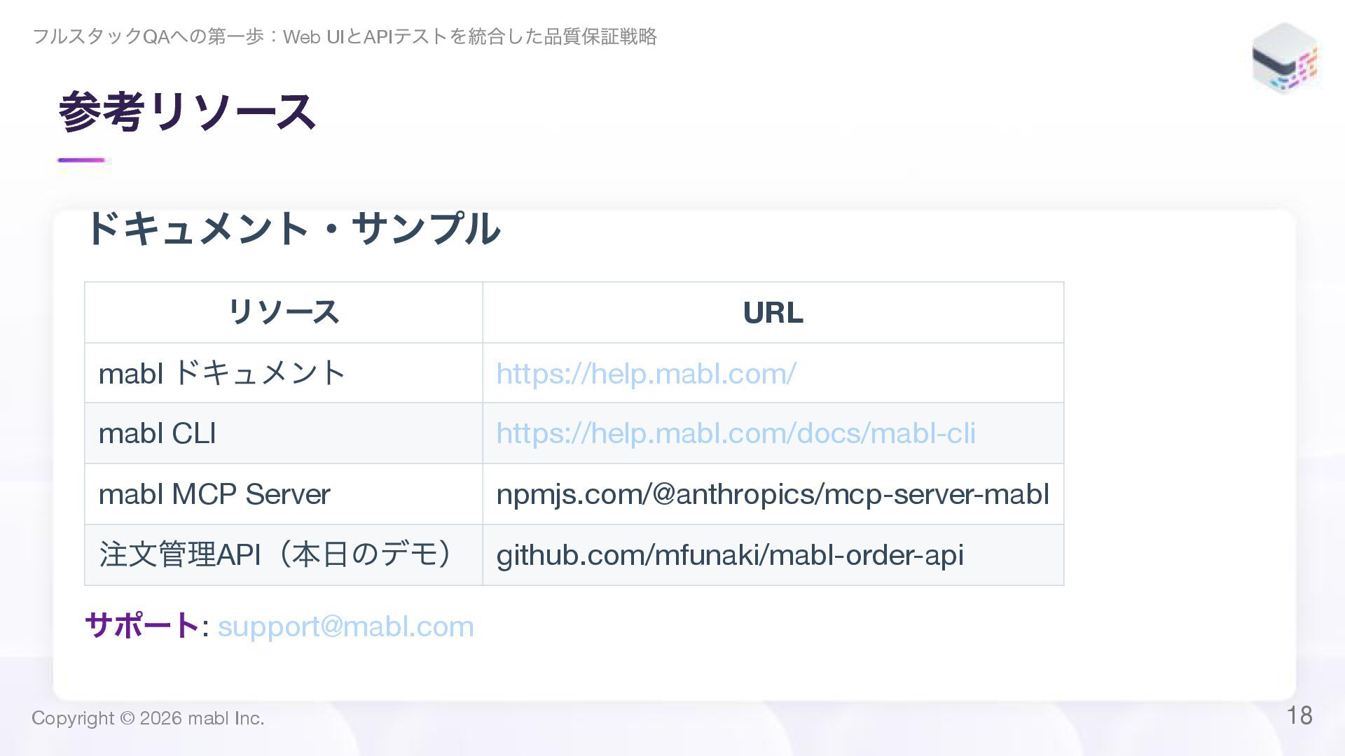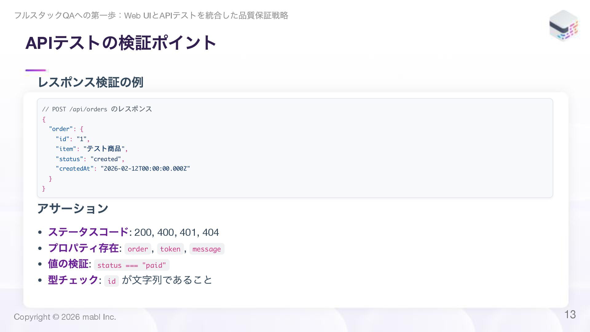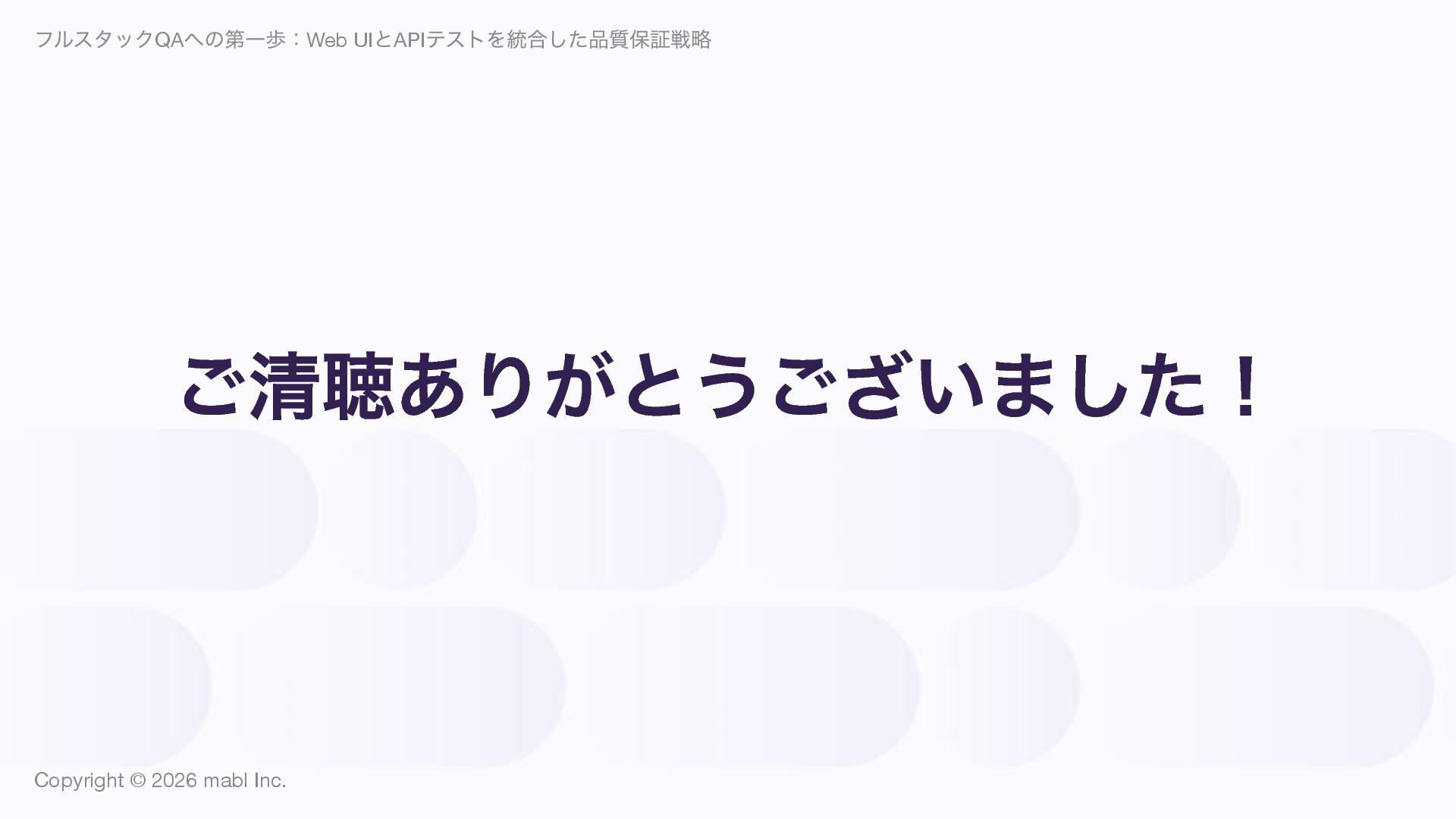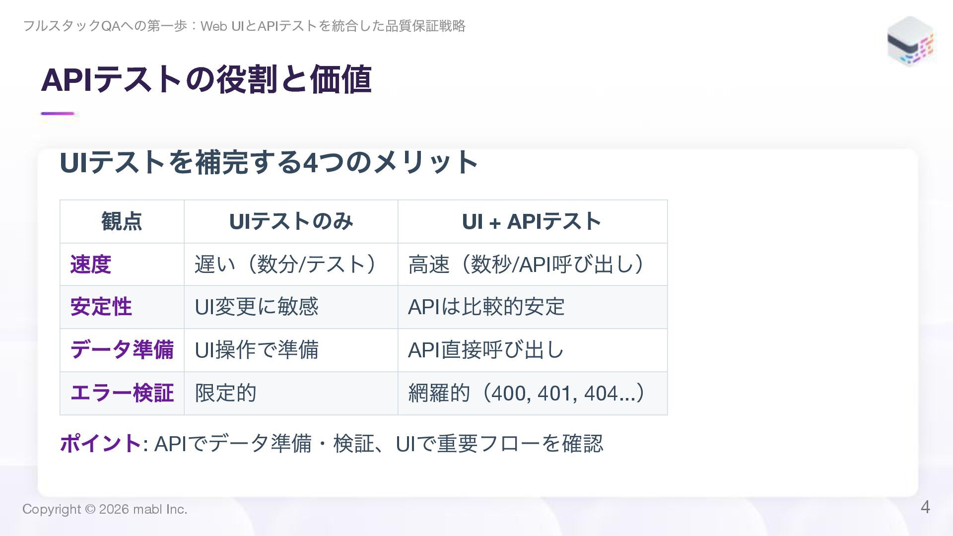 2026/02/12に開催した mabl のウェビナー「フルスタックQAへの第一歩。Web UIとAPIテストを統合した品質保証戦略」で使用したスライドです。