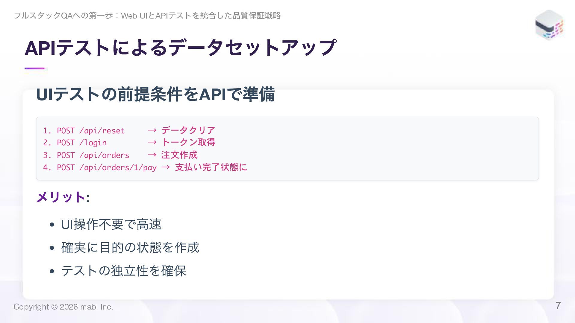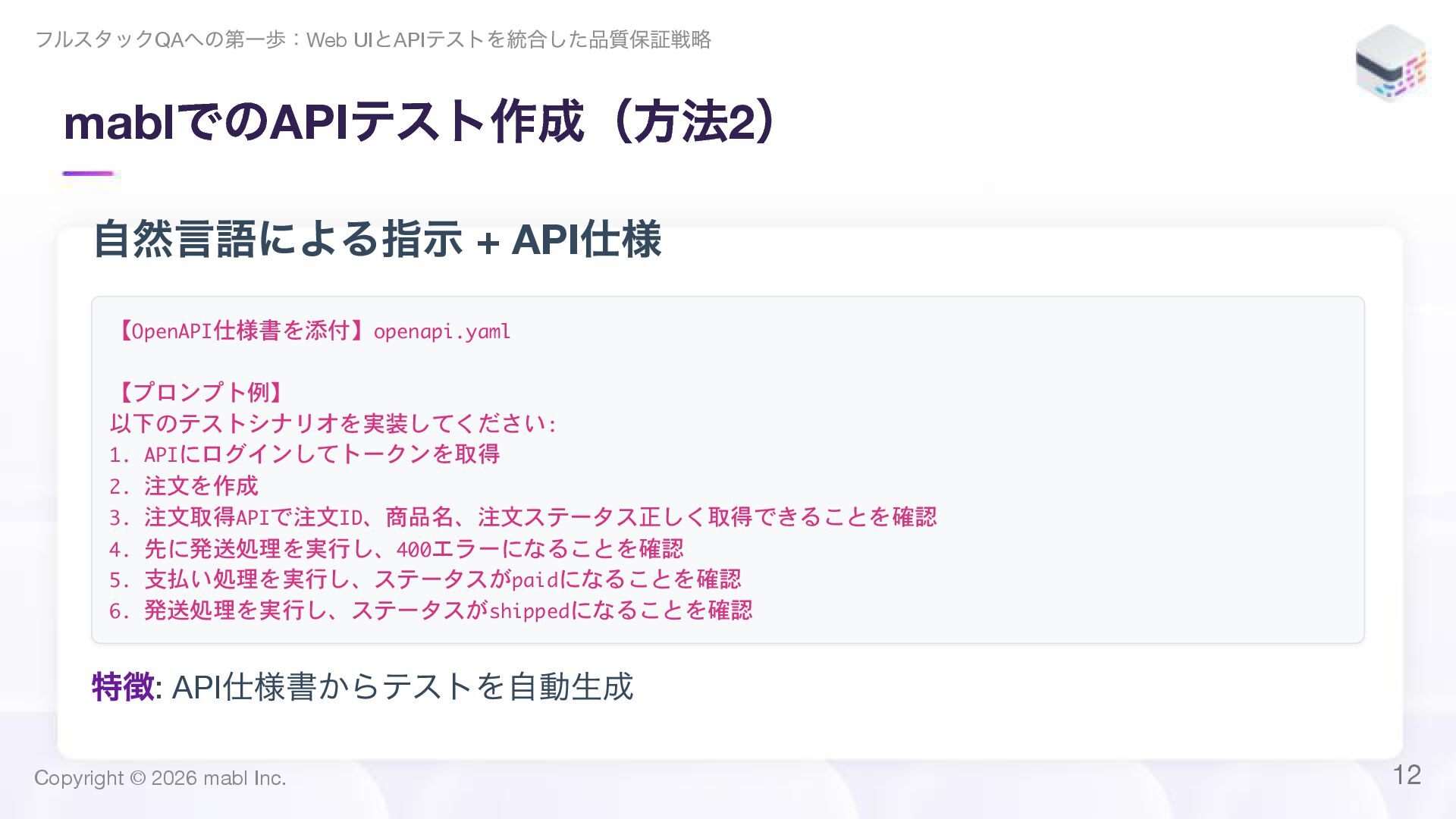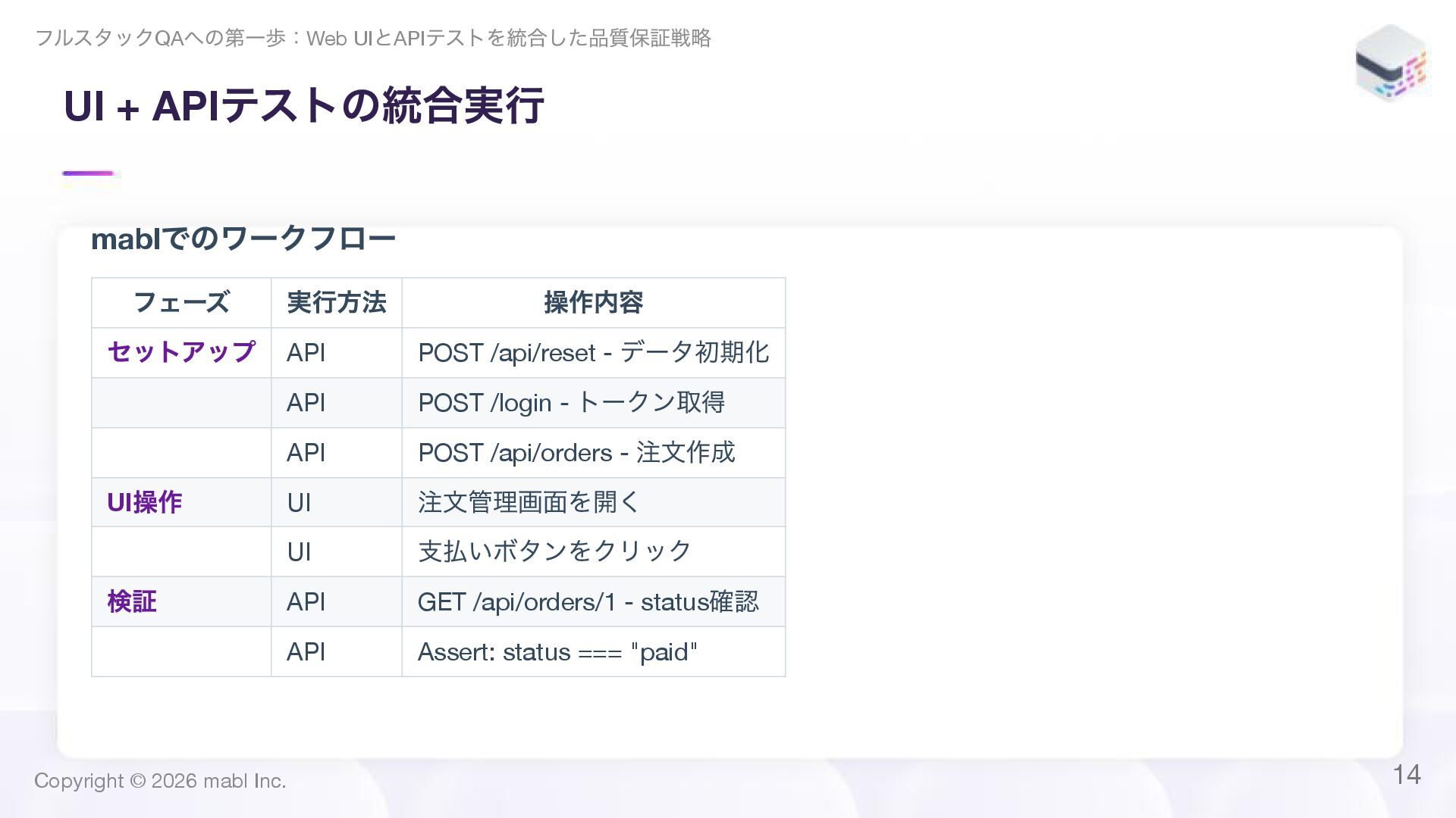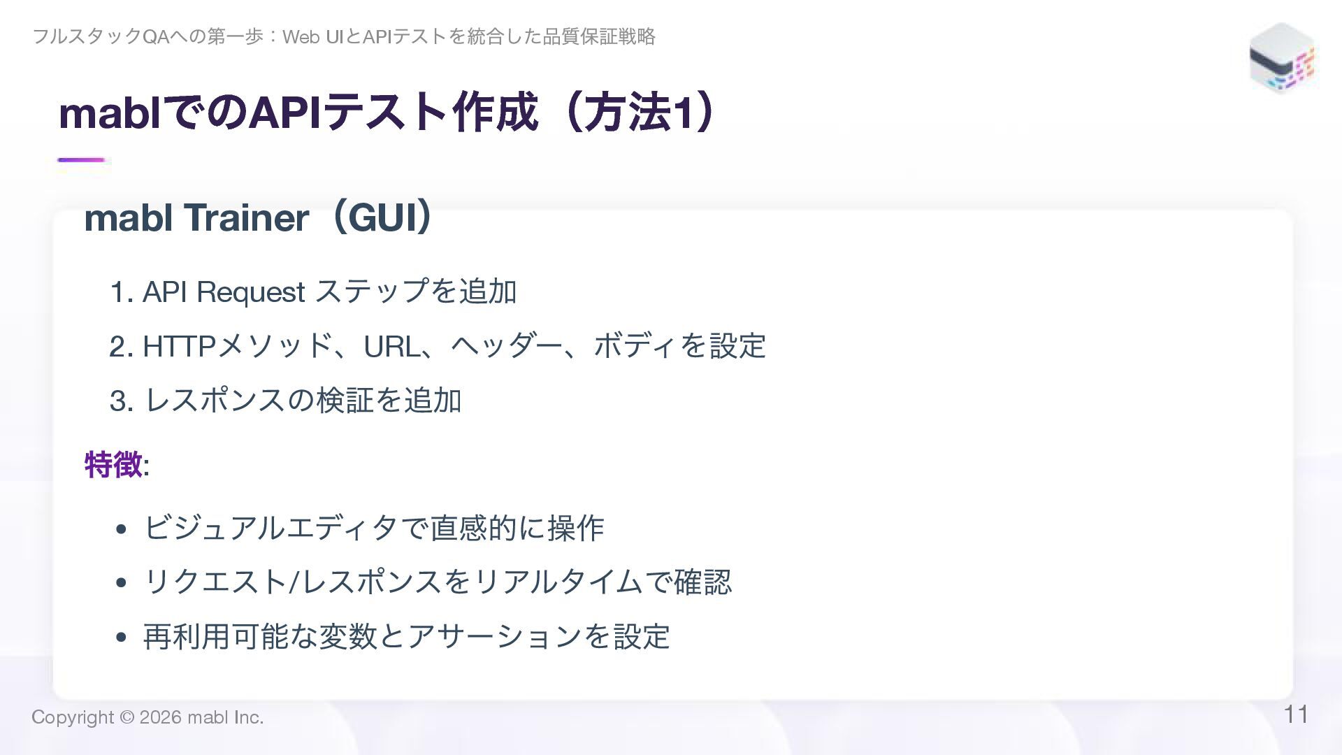 2026/02/12に開催した mabl のウェビナー「フルスタックQAへの第一歩。Web UIとAPIテストを統合した品質保証戦略」で使用したスライドです。