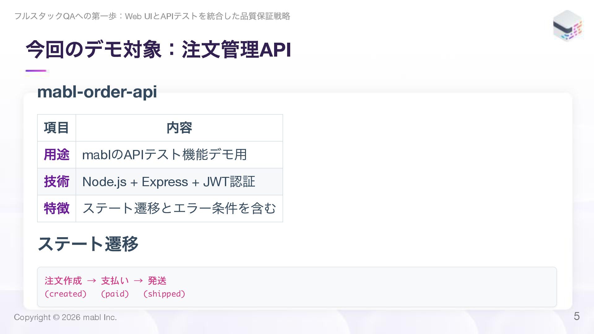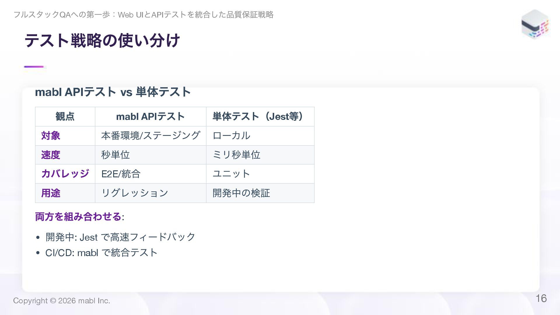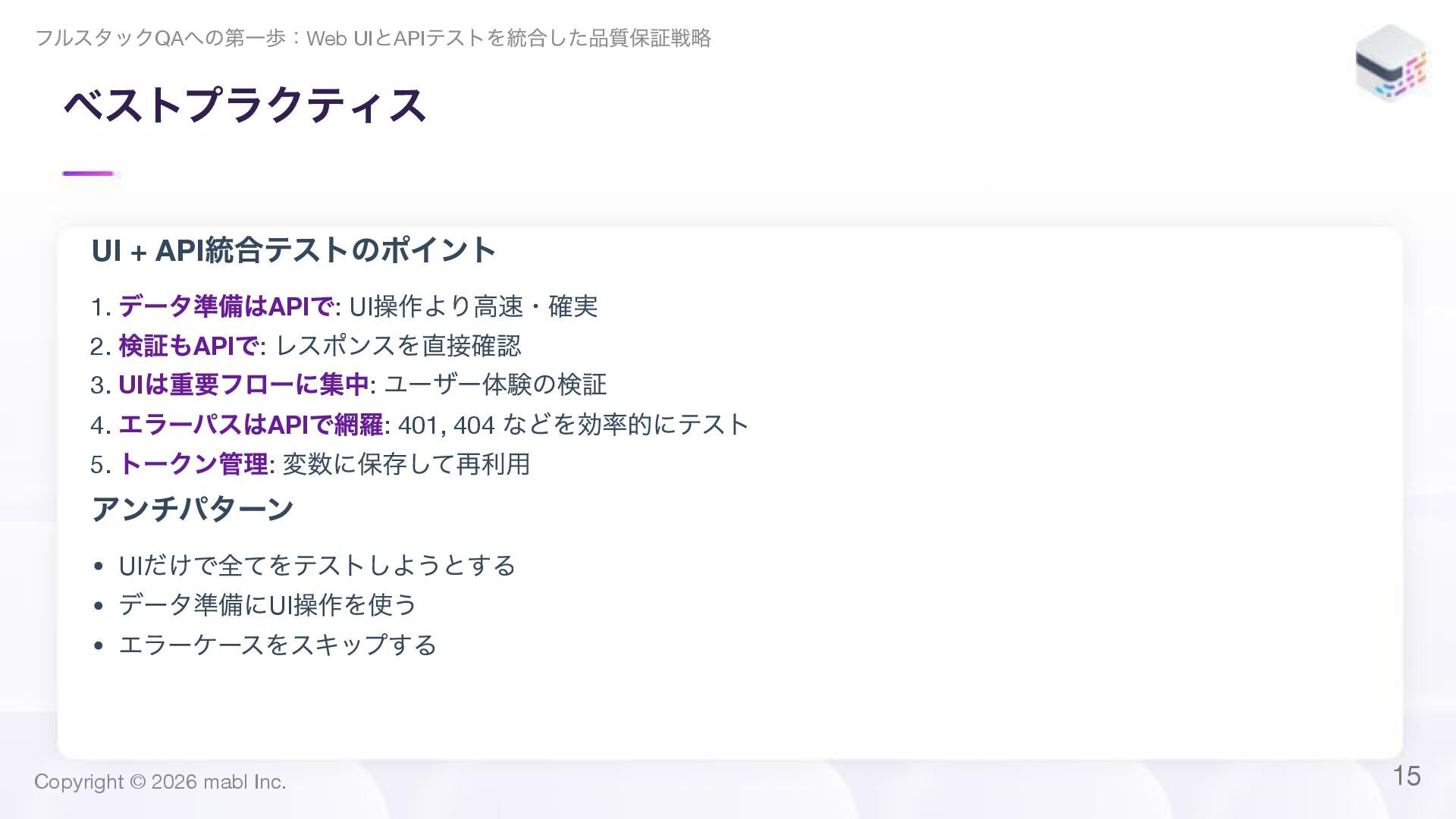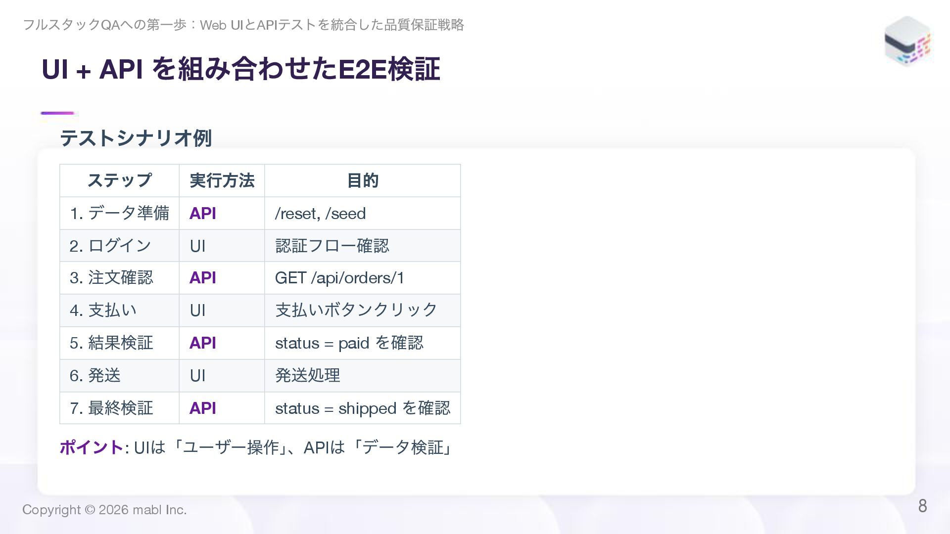 2026/02/12に開催した mabl のウェビナー「フルスタックQAへの第一歩。Web UIとAPIテストを統合した品質保証戦略」で使用したスライドです。