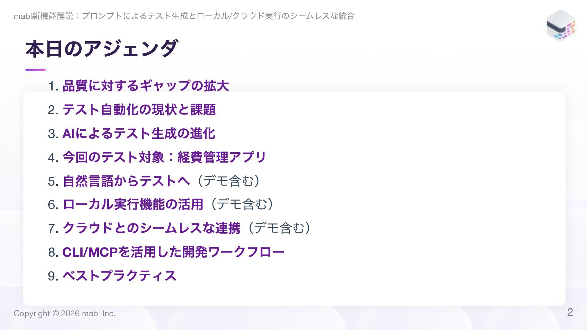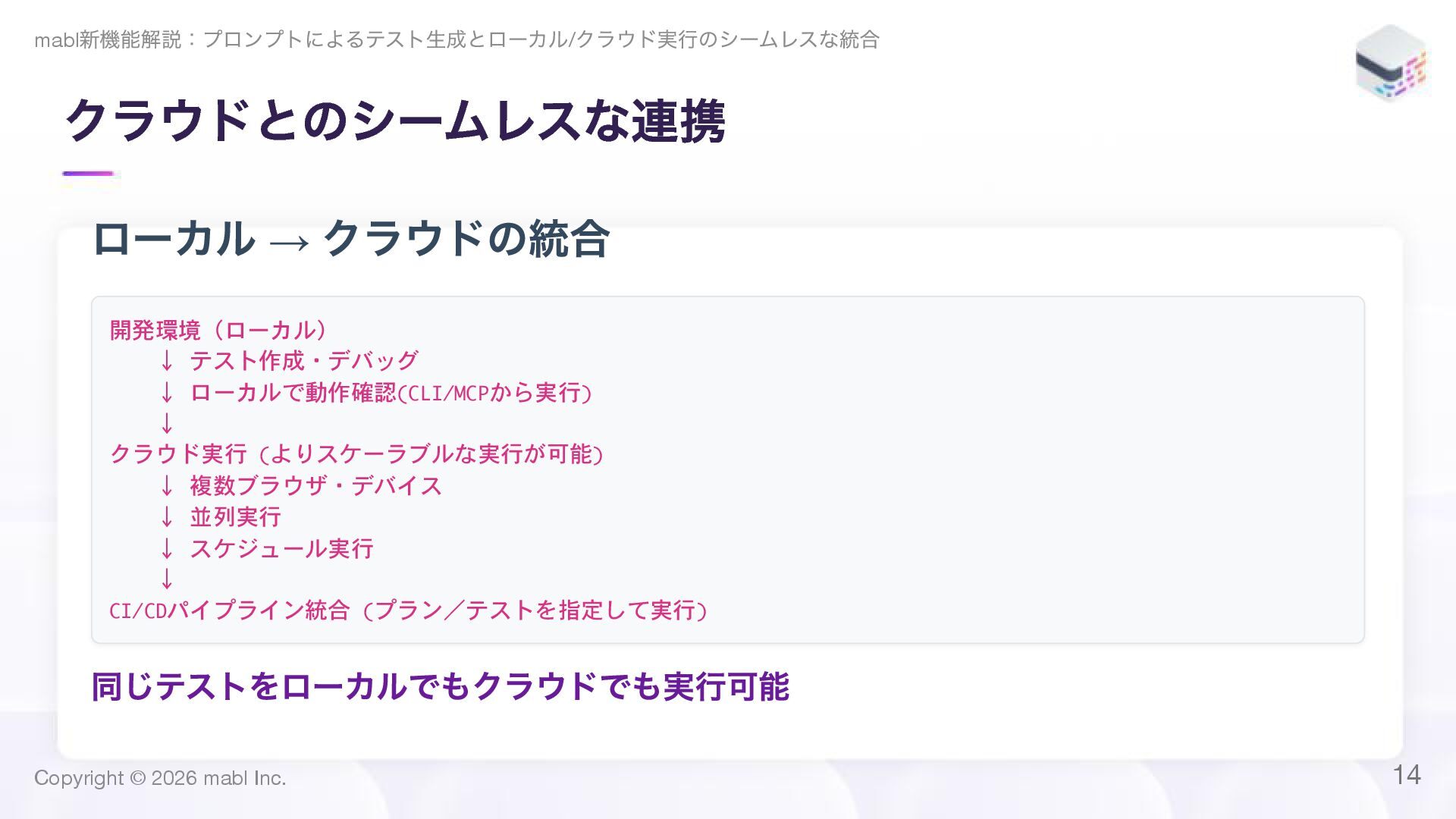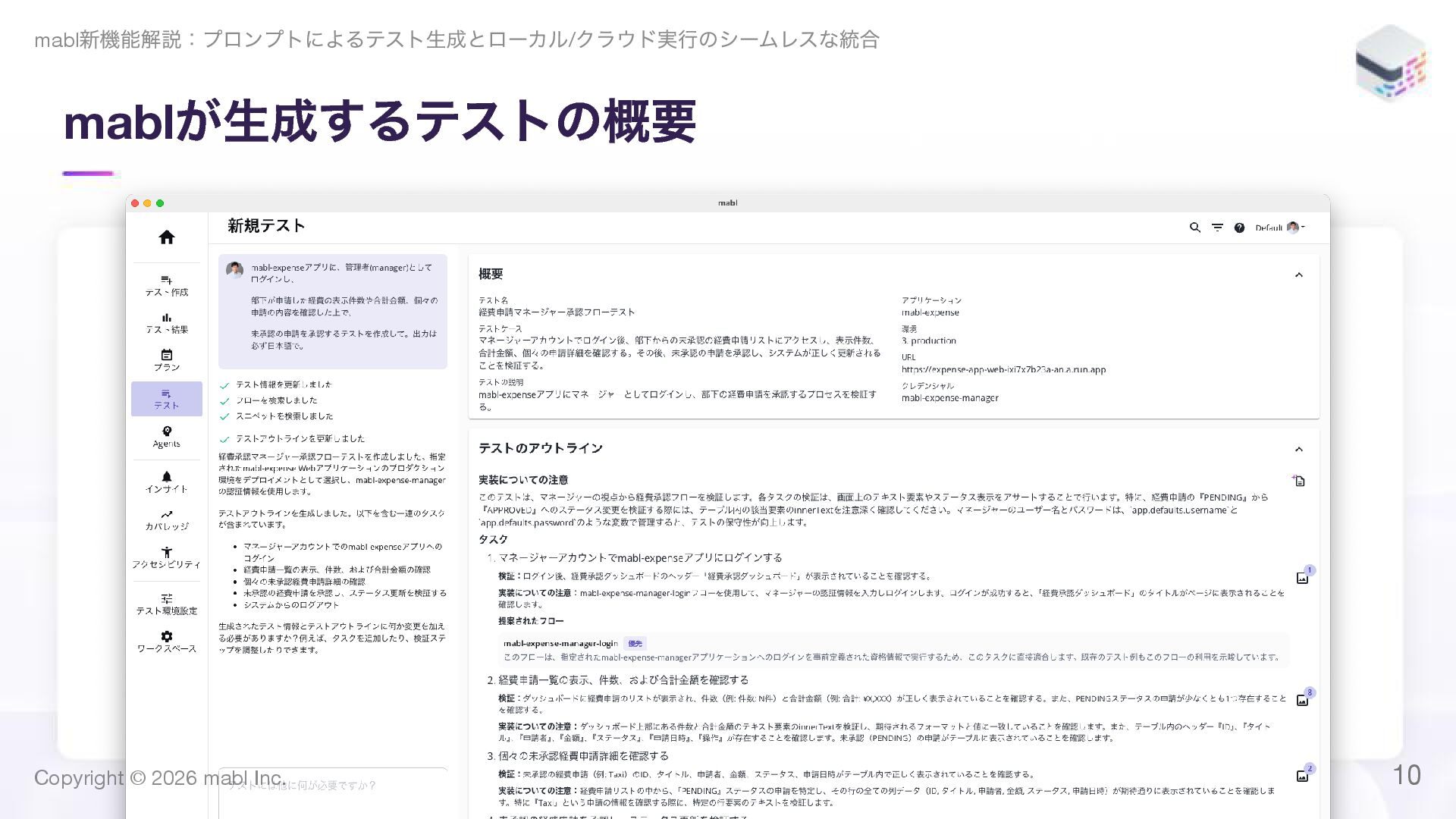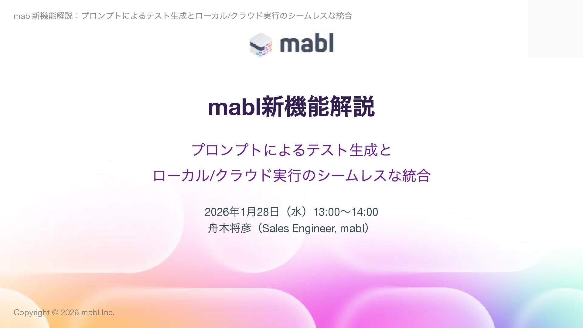 2026/01/28 に開催したウェビナー「mabl新機能解説:プロンプトによるテスト生成とローカル/クラウド実行のシームレスな統合」にて使用した資料です。