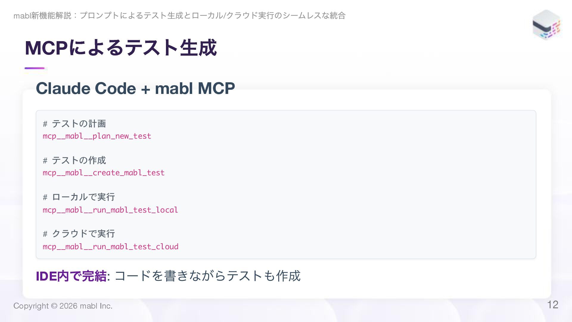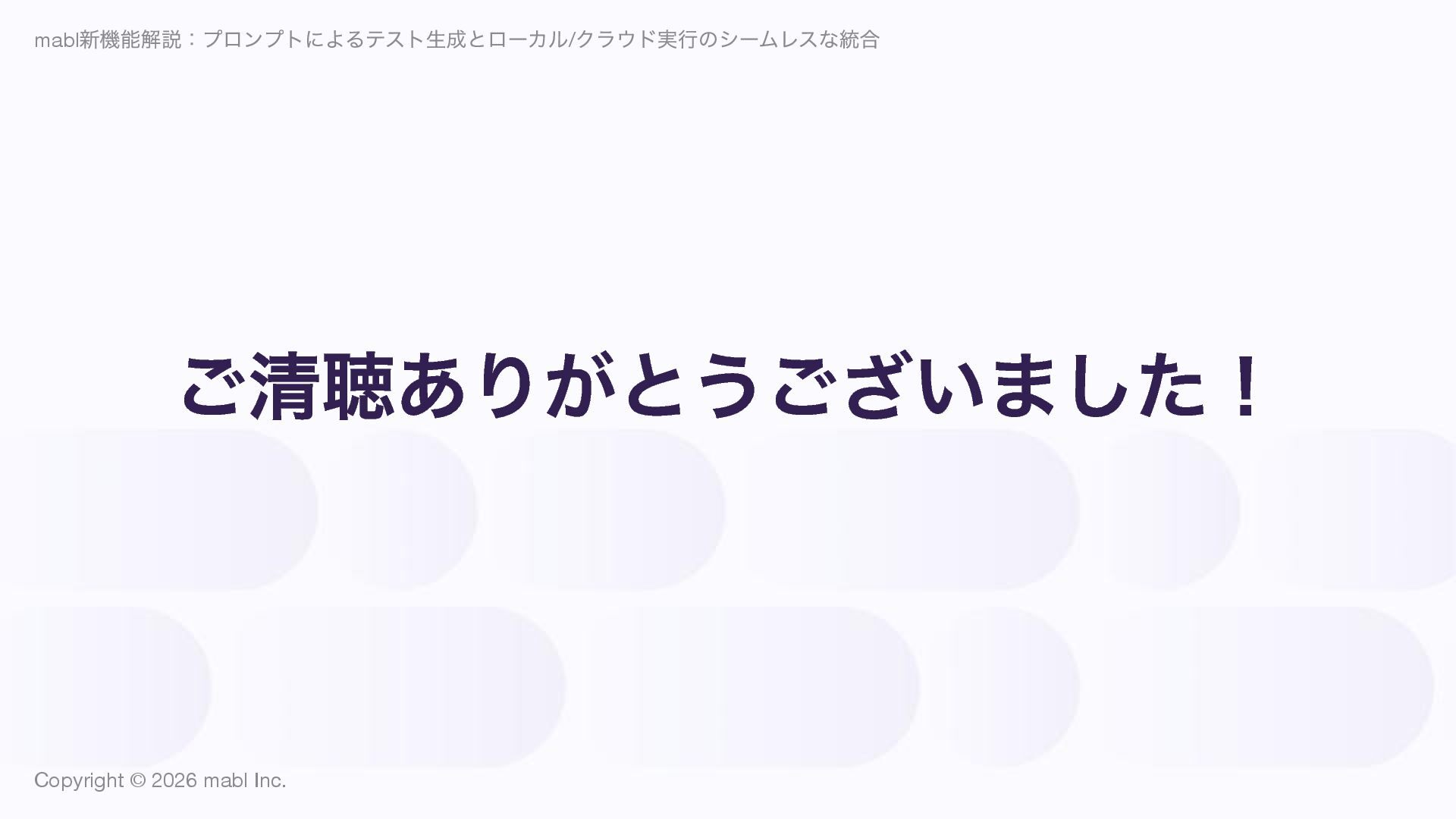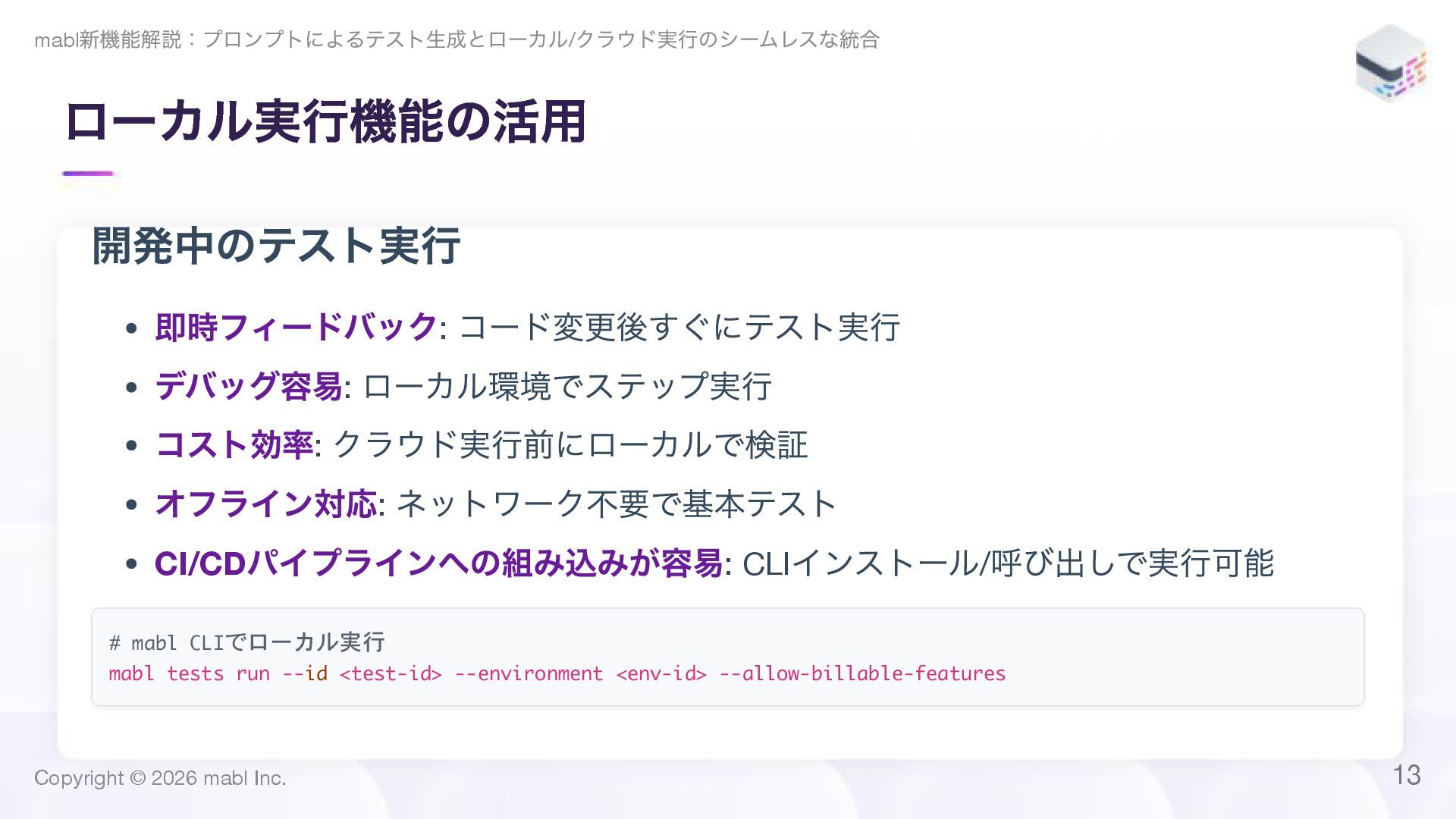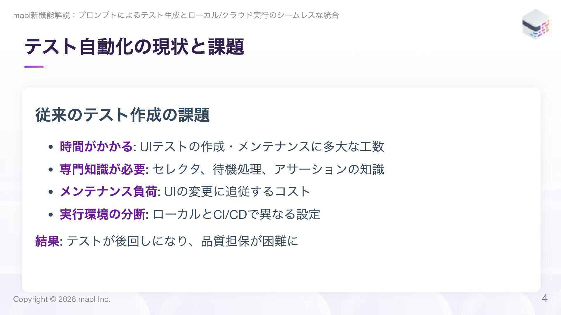 2026/01/28 に開催したウェビナー「mabl新機能解説:プロンプトによるテスト生成とローカル/クラウド実行のシームレスな統合」にて使用した資料です。