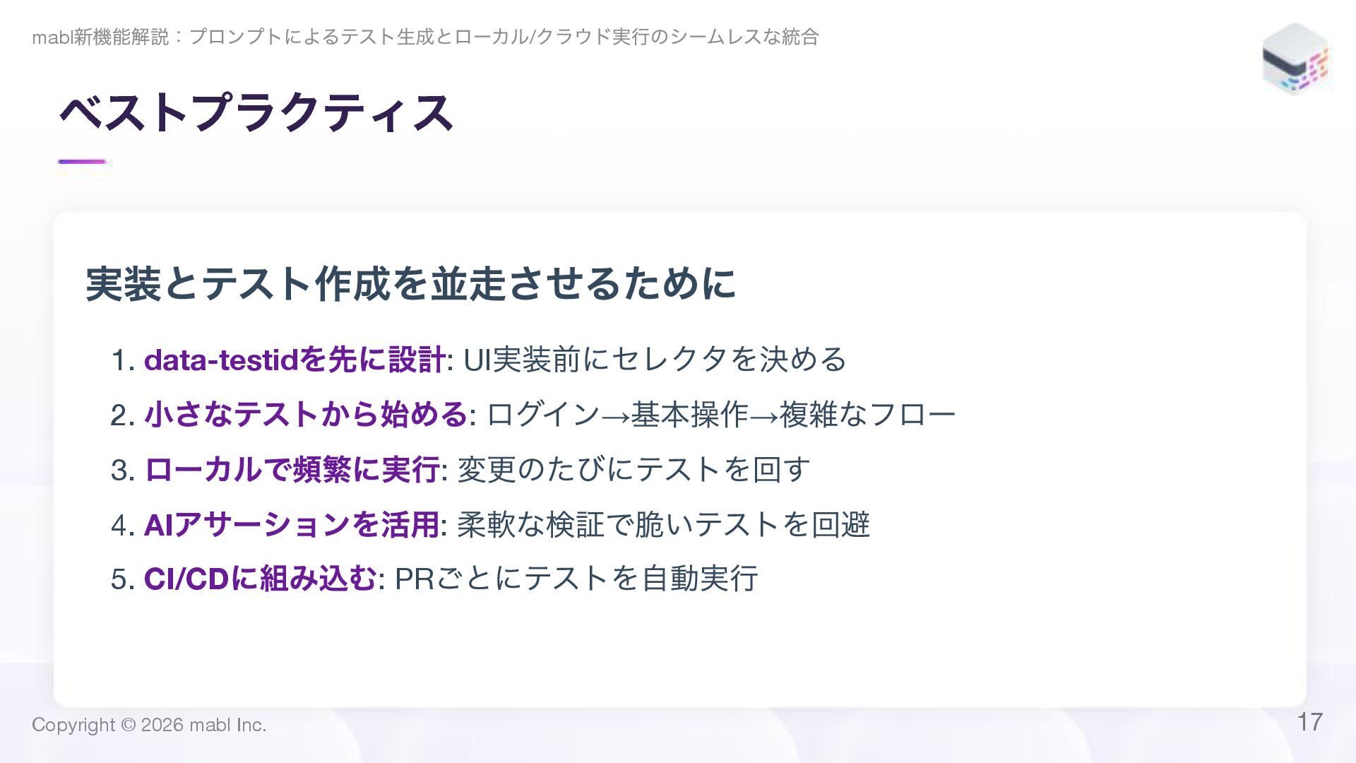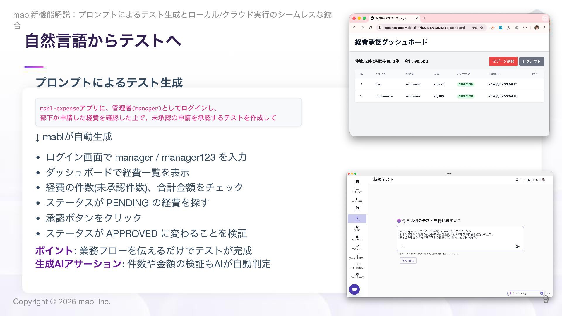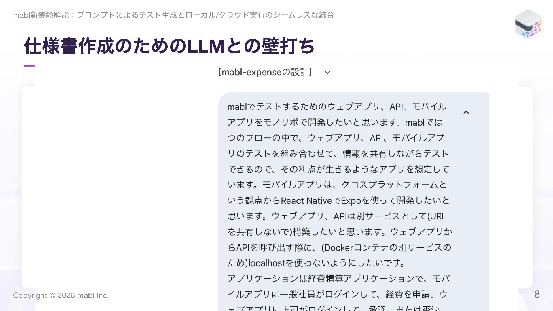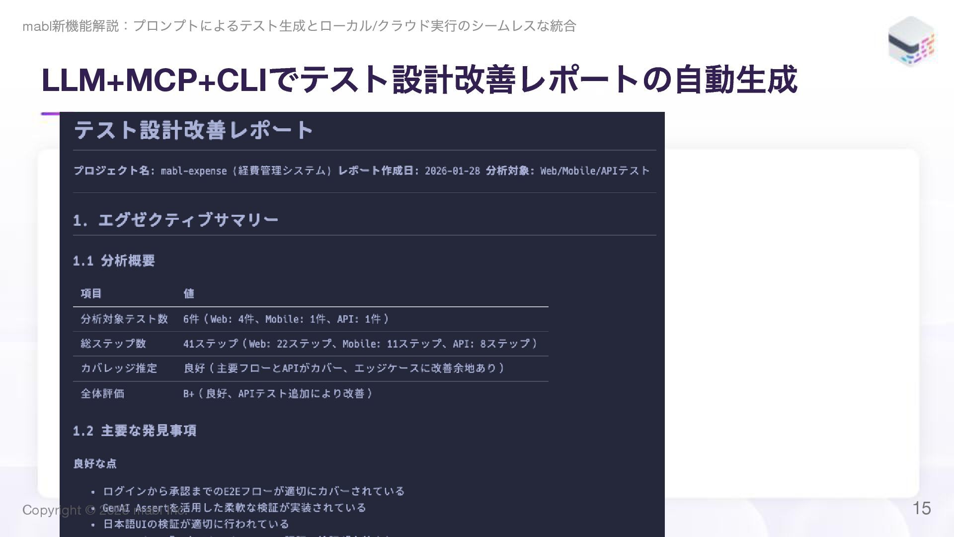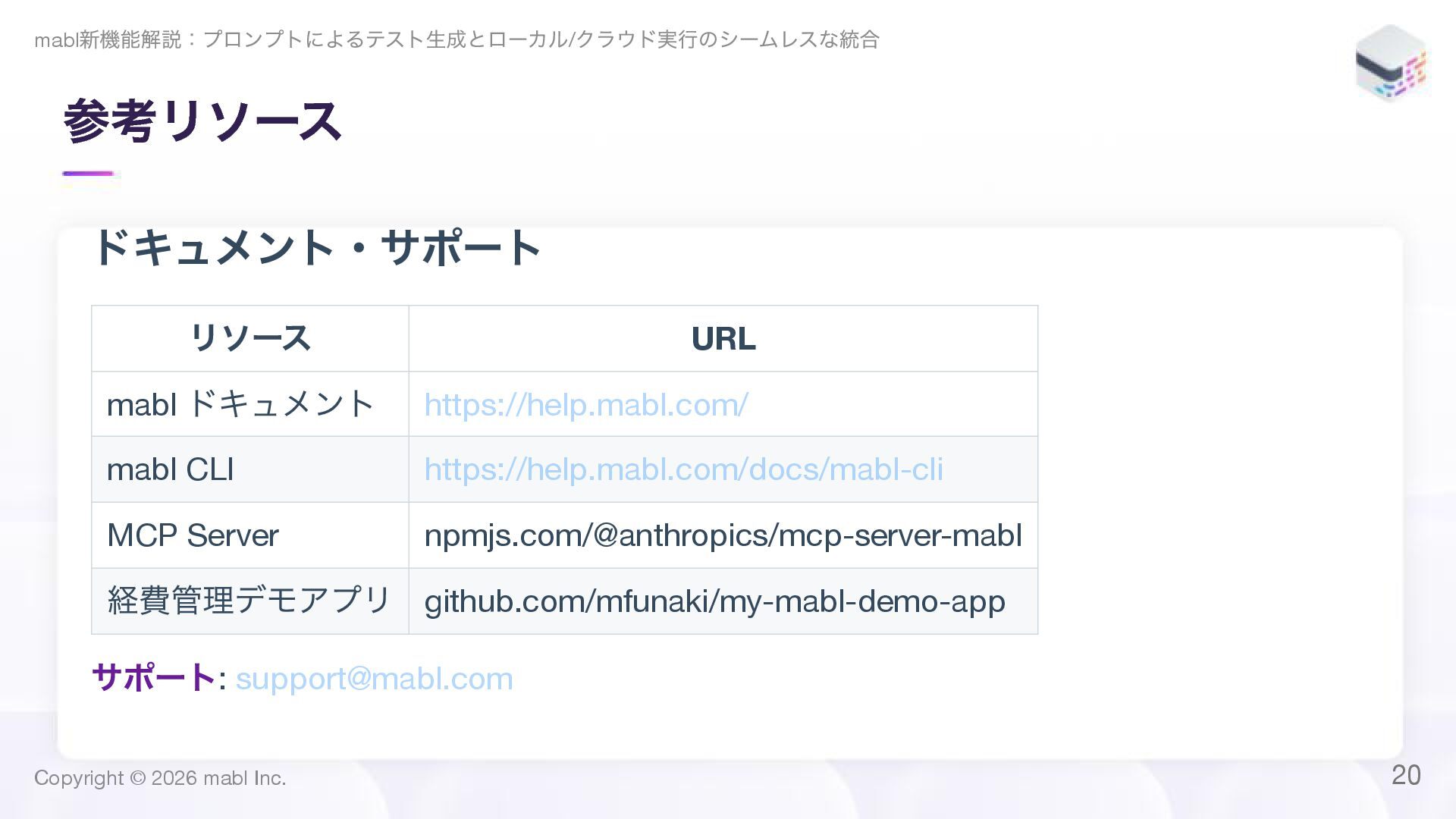2026/01/28 に開催したウェビナー「mabl新機能解説:プロンプトによるテスト生成とローカル/クラウド実行のシームレスな統合」にて使用した資料です。