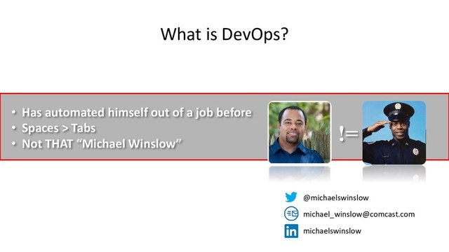DevOps? • Minor Reason: Production Support • Temporarily fix Production issues • Major Reason: Process Improvement • Permanently fix issues that were found in Production • Find issues before they reach Production • Reduce the time it takes to identify production issues • Reduce the time it takes to reproduce production issues in other (safe) environments for testing • Reduce the time it takes to move software through the pipeline @michaelswinslow