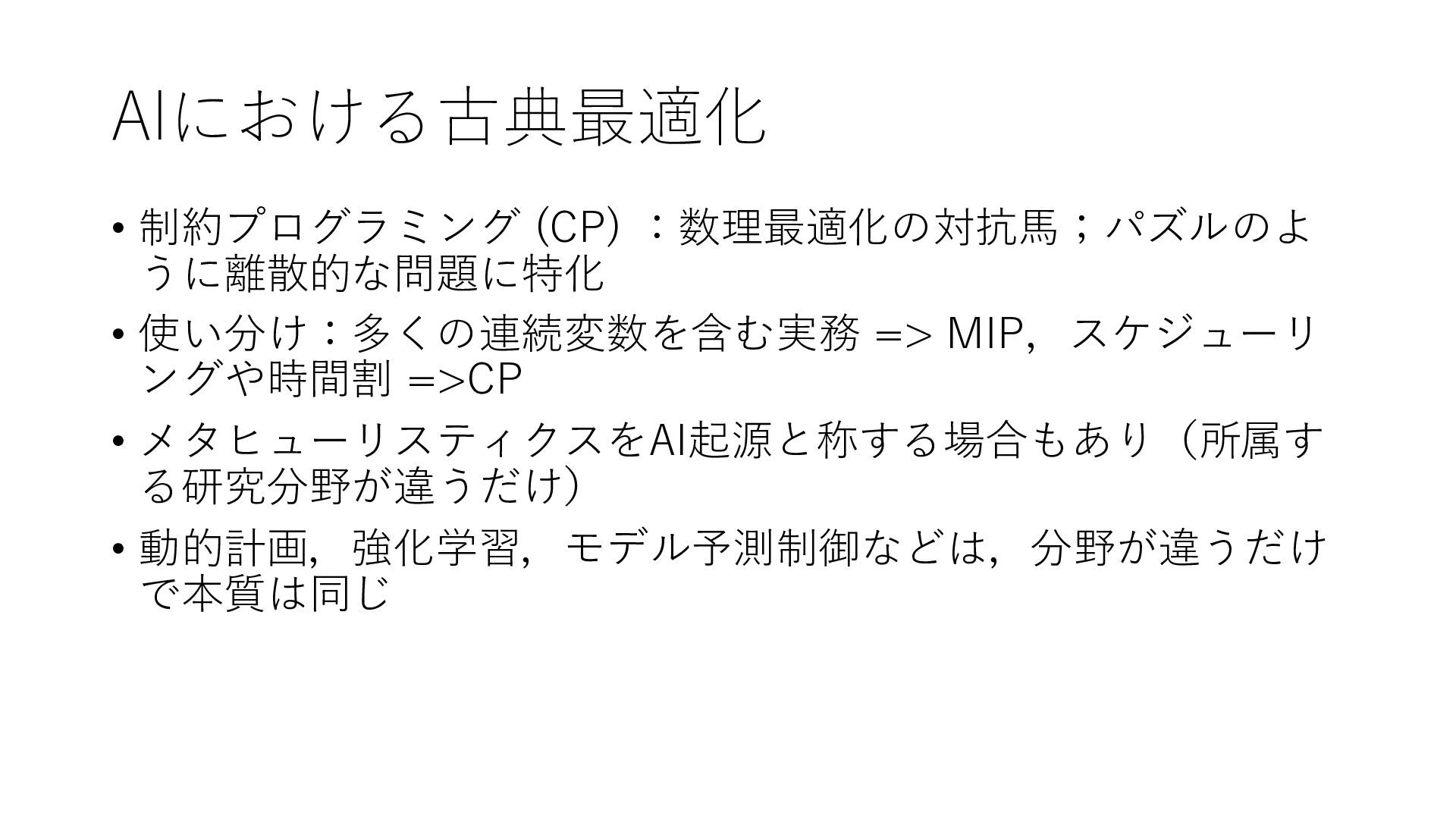 ングや時間割 =>CP • メタヒューリスティクスをAI起源と称する場合もあり(所属す る研究分野が違うだけ) • 動的計画,強化学習,モデル予測制御などは,分野が違うだけ で本質は同じ