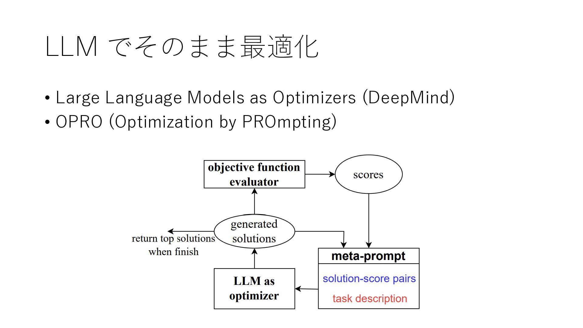 LLM でそのまま最適化 • Large Language Models as Optimizers (DeepMind) •