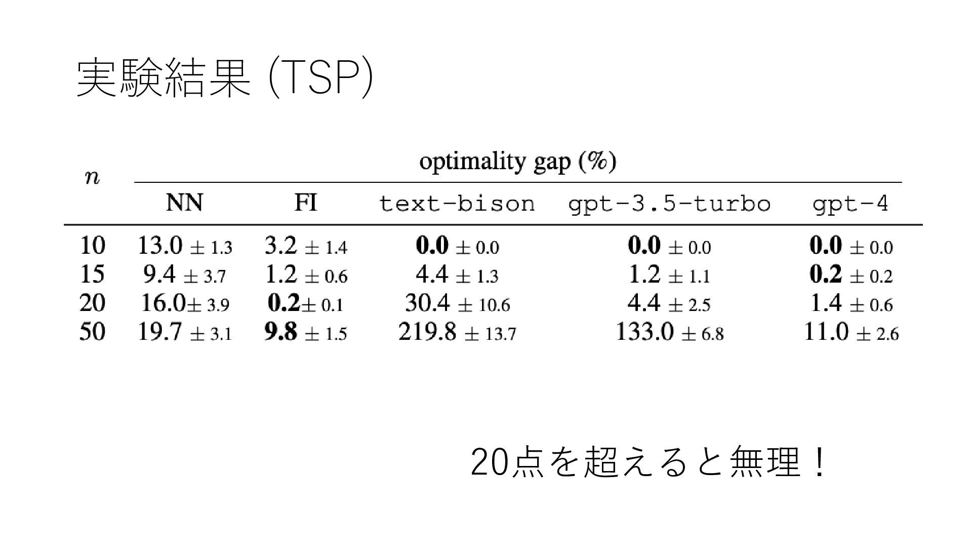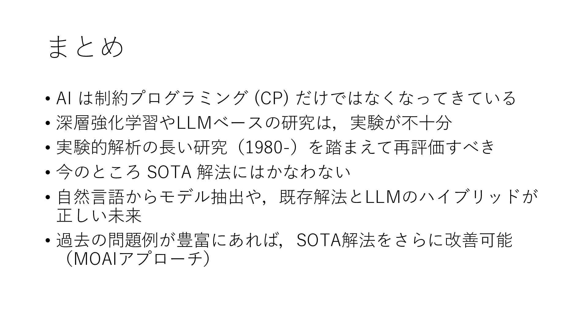 • 今のところ SOTA 解法にはかなわない • 自然言語からモデル抽出や,既存解法とLLMのハイブリッドが 正しい未来 • 過去の問題例が豊富にあれば,SOTA解法をさらに改善可能 (MOAIアプローチ)