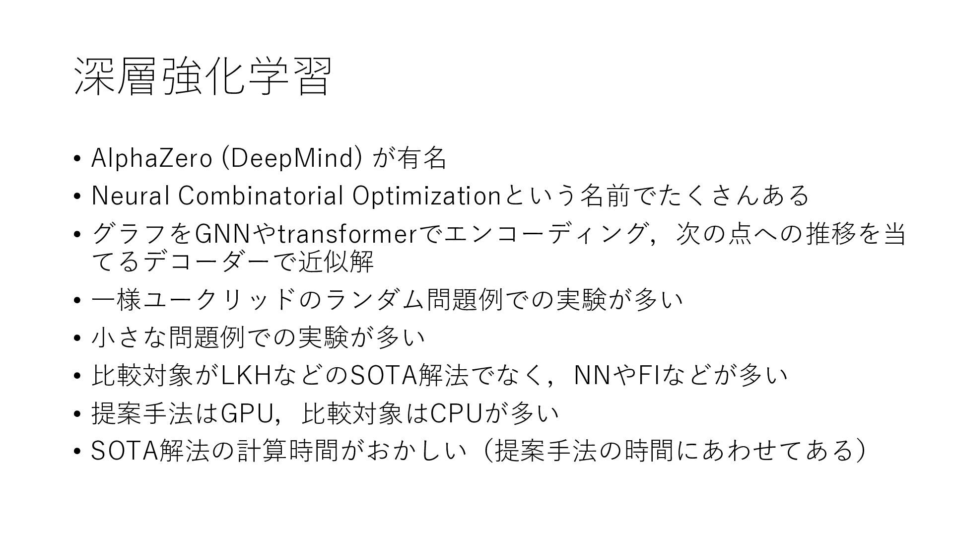 グラフをGNNやtransformerでエンコーディング,次の点への推移を当 てるデコーダーで近似解 • 一様ユークリッドのランダム問題例での実験が多い • 小さな問題例での実験が多い • 比較対象がLKHなどのSOTA解法でなく,NNやFIなどが多い • 提案手法はGPU,比較対象はCPUが多い • SOTA解法の計算時間がおかしい(提案手法の時間にあわせてある)