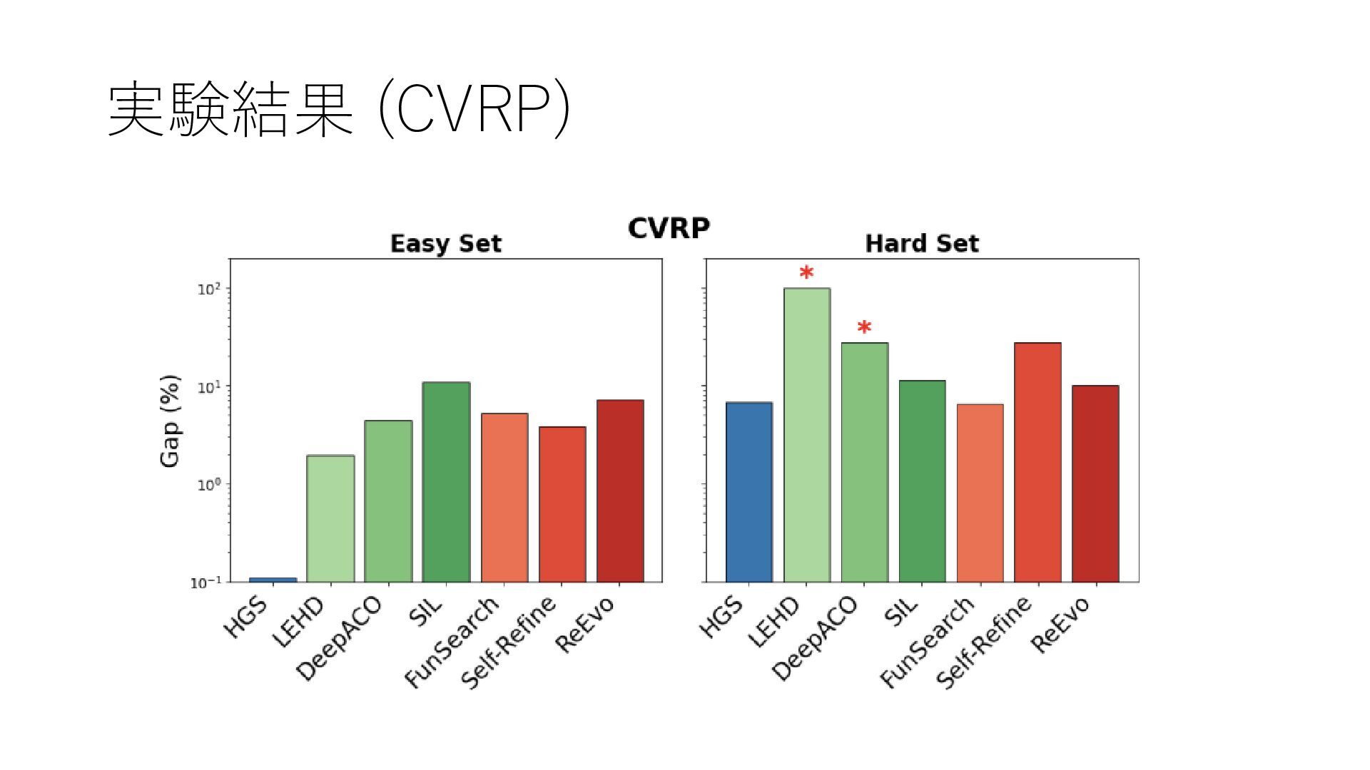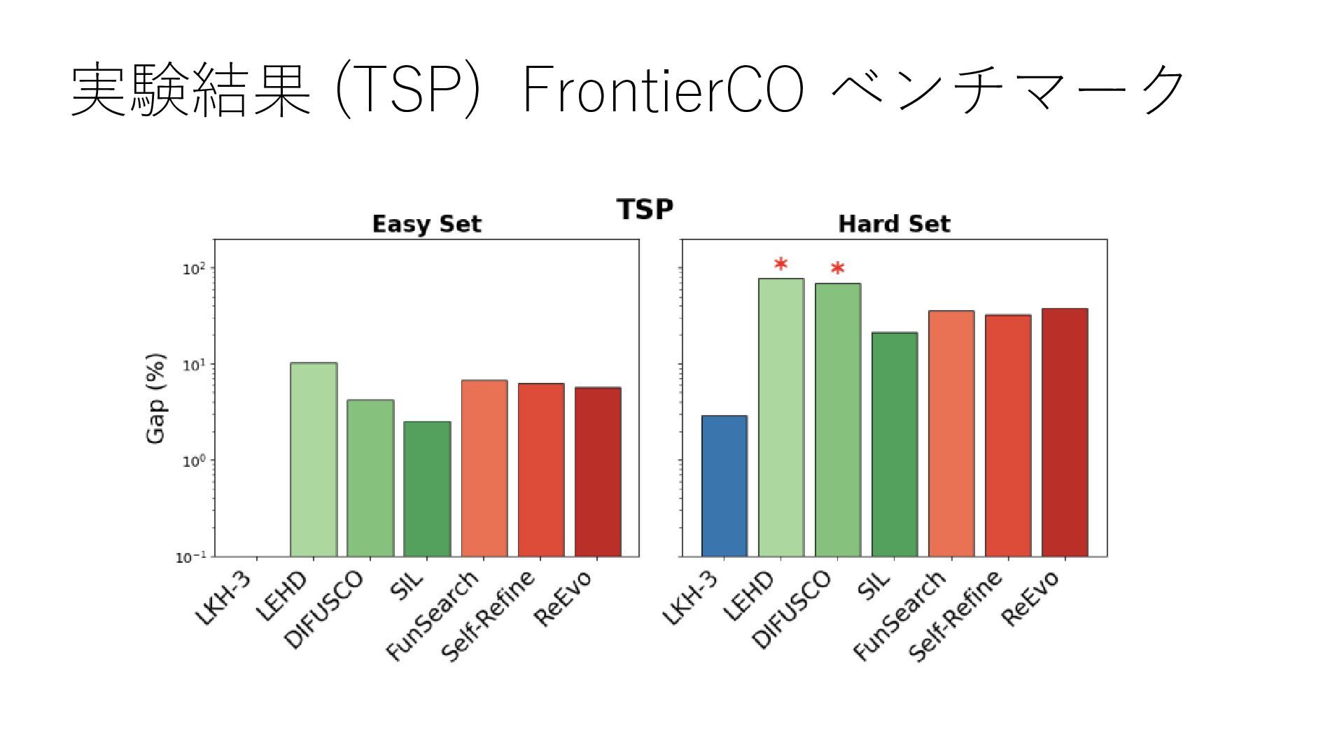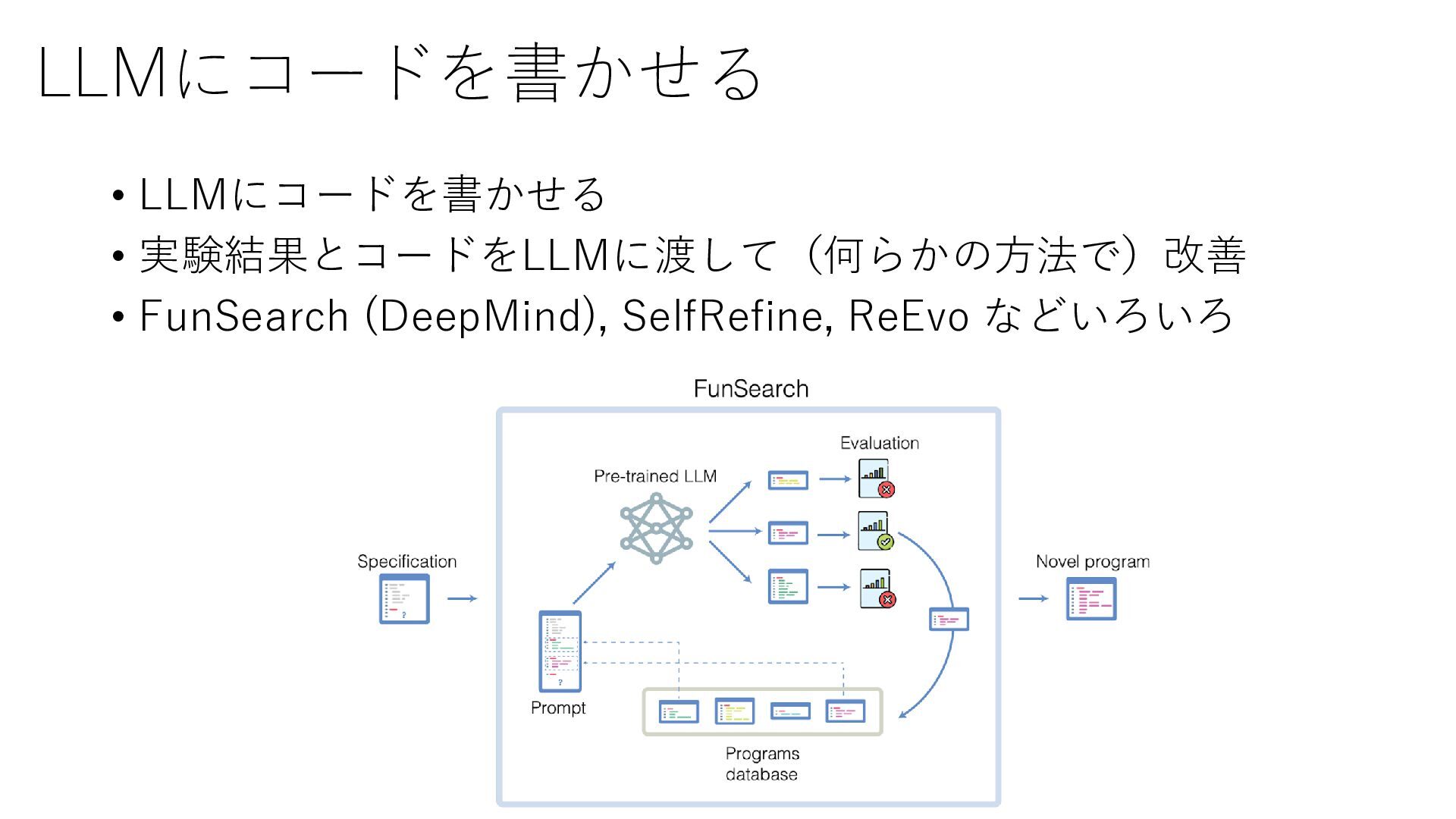 LLMにコードを書かせる • LLMにコードを書かせる • 実験結果とコードをLLMに渡して(何らかの方法で)改善 • FunSearch (DeepMind), SelfRefine, ReEvo