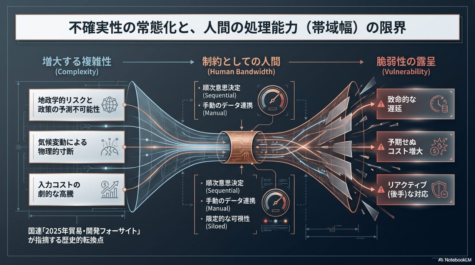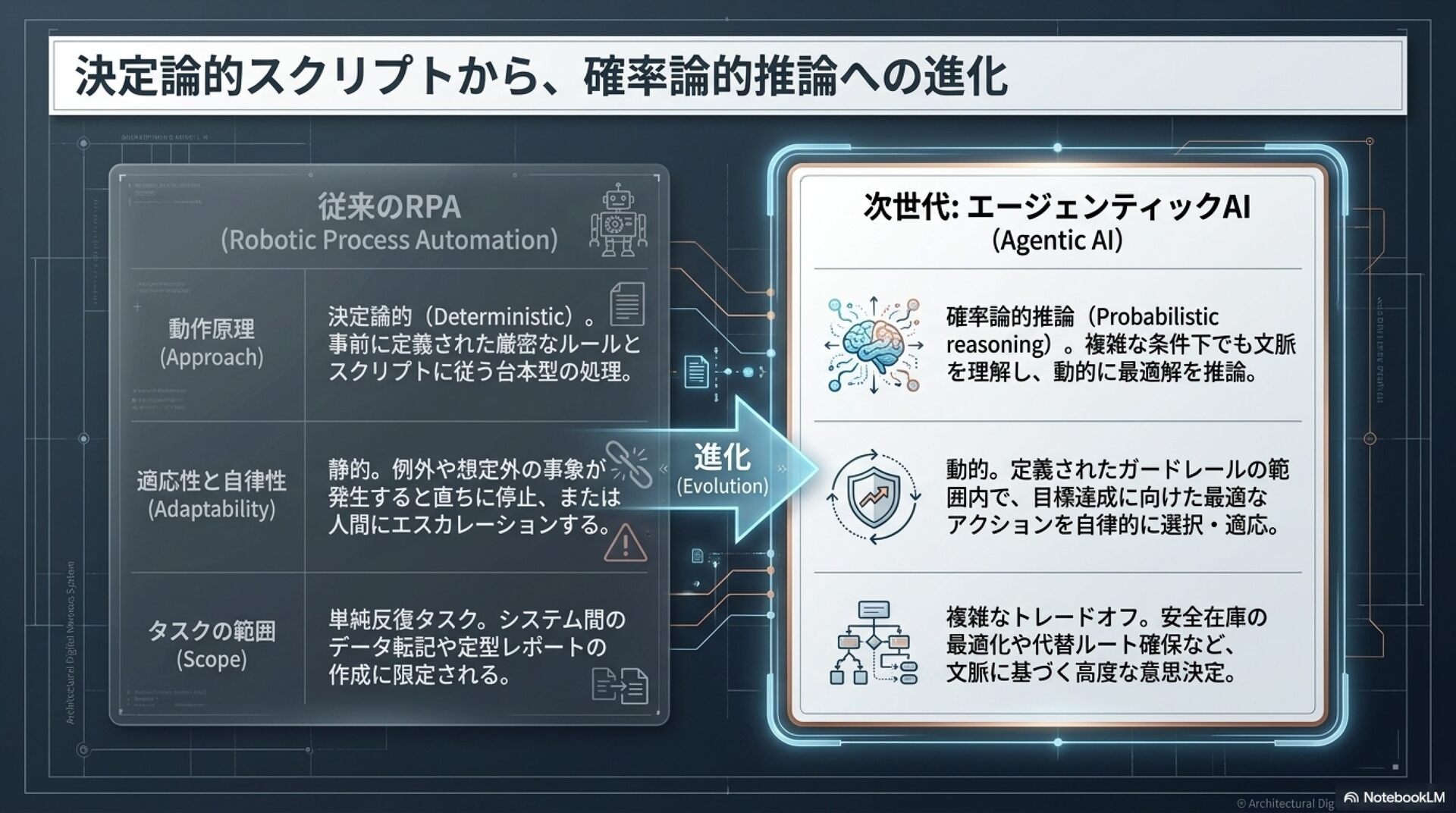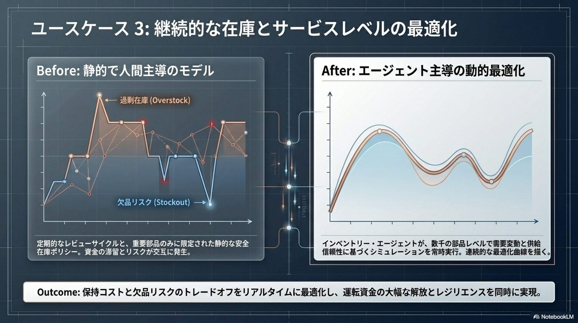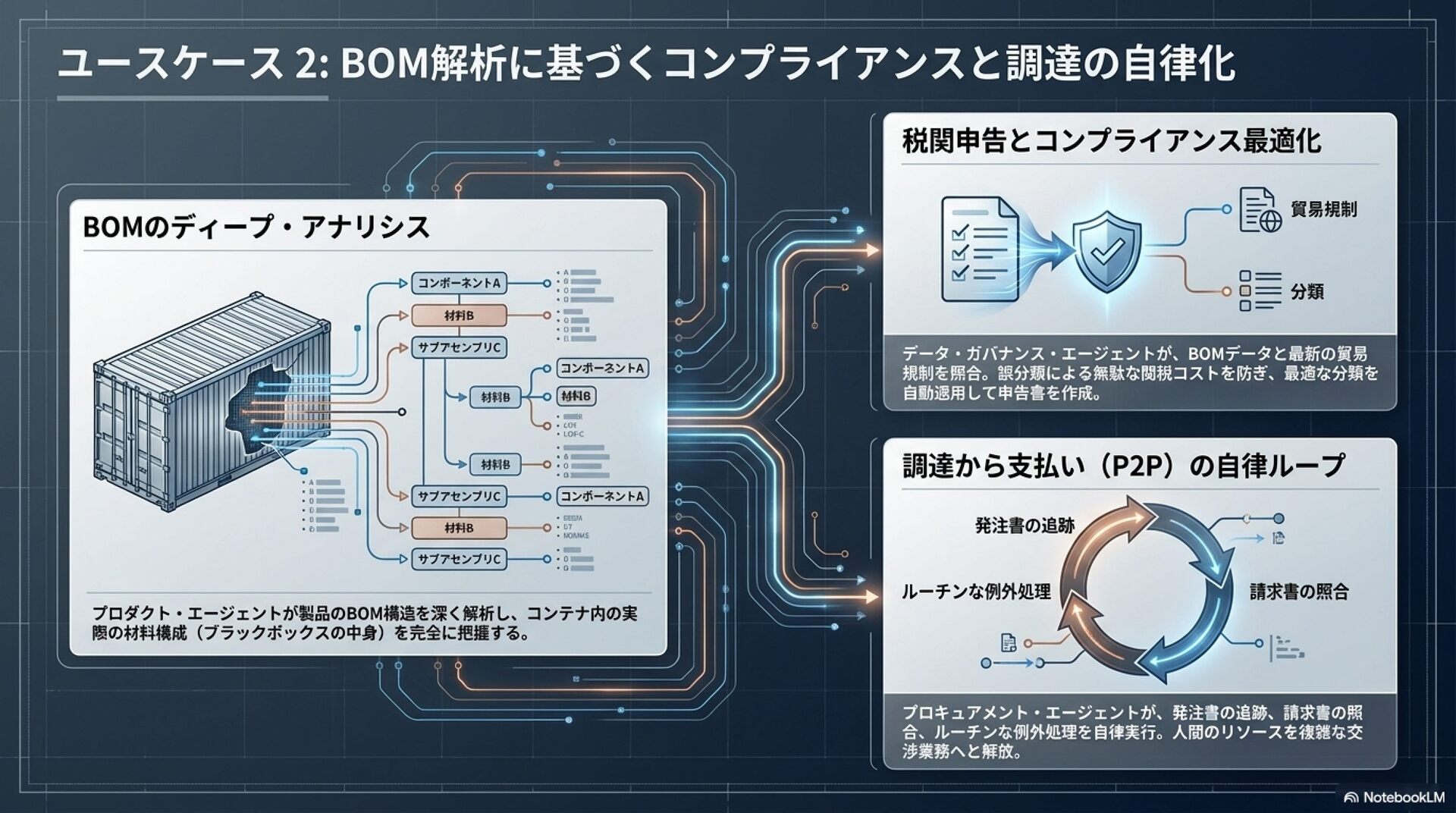 「エージェンティック・サプライチェーン」の概念と、製造業におけるその革新的な役割について解説しています。エージェンティックAIは、従来の自動化とは異なり、自律的な思考や計画、実行能力を備え、複雑な供給網のリスク管理や意思決定を劇的に効率化します。記事内では、在庫の最適化や物流の自動調整、通関業務の効率化など、多岐にわたる具体的な活用事例が紹介されています。この技術の導入により、人間は定型業務から解放され、より戦略的な判断に集中できるようになります。最終的に、企業がこの変革を成功させるためには、データ基盤の整備や組織文化の刷新、そして人間とAIが共生する新しい運用モデルの構築が不可欠であると結論付けています。