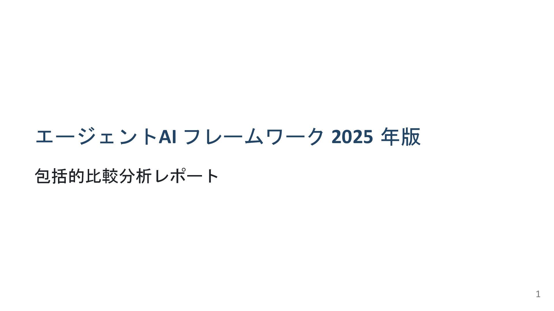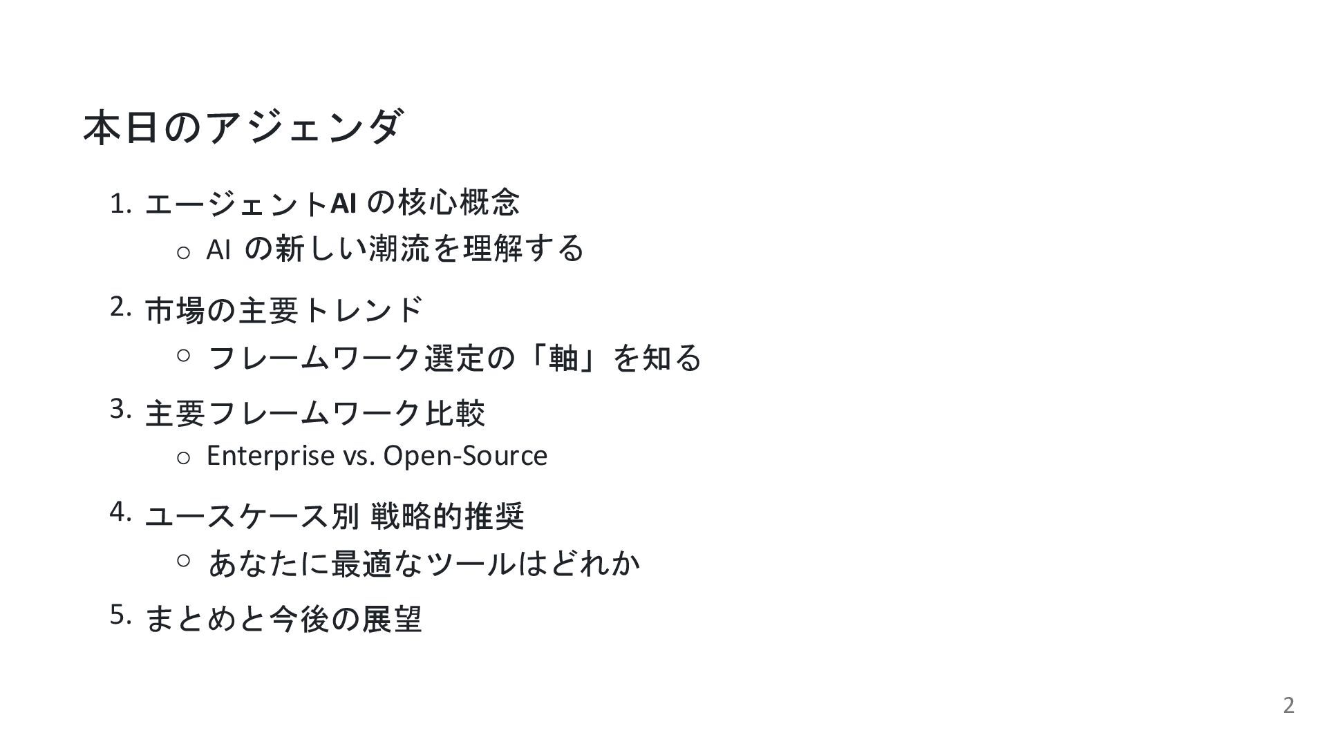 主要フレームワーク比較 Enterprise vs. Open-Source 4. ユースケース別 戦略的推奨 あなたに最適なツールはどれか 5. まとめと今後の展望 2