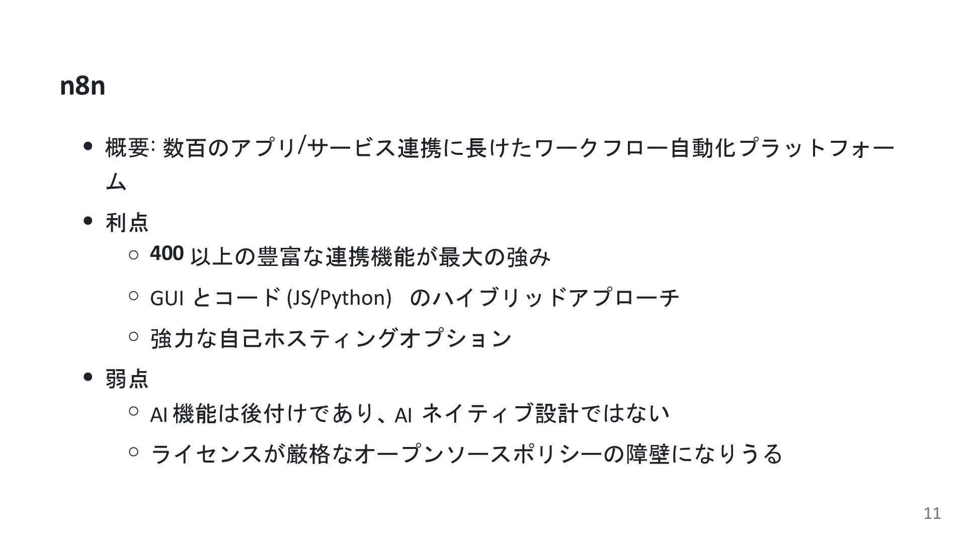 8. n8n 概要: 数百のアプリ/サービス連携に長けたワークフロー自動化プラットフォー ム 利点 400 以上の豊富な連携機能が最大の強み GUI とコード (JS/Python)