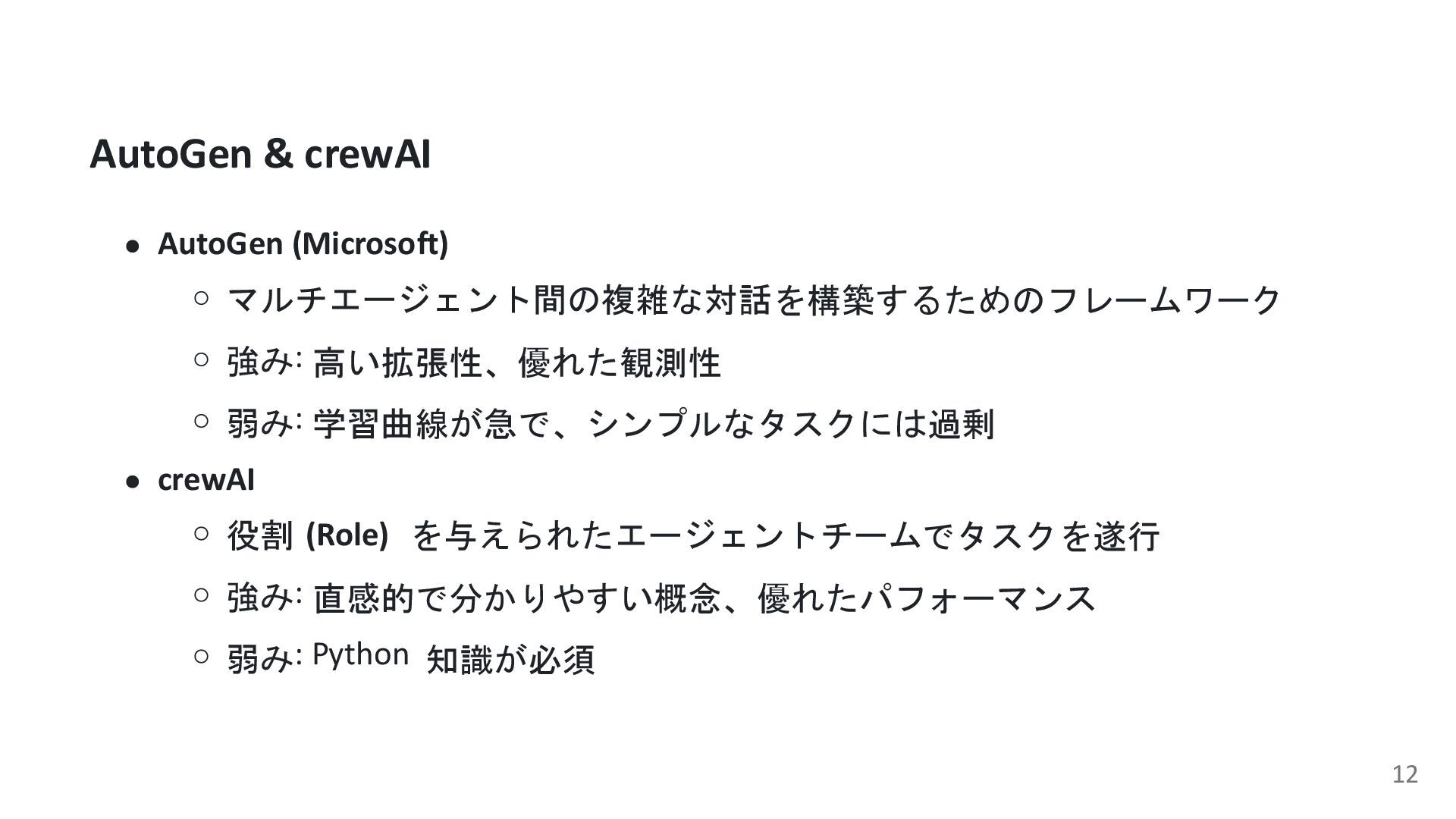 9. AutoGen & crewAI AutoGen (Microsoft) マルチエージェント間の複雑な対話を構築するためのフレームワーク 強み: 高い拡張性、優れた観測性 弱み: 学習曲線が急で、シンプルなタスクには過剰